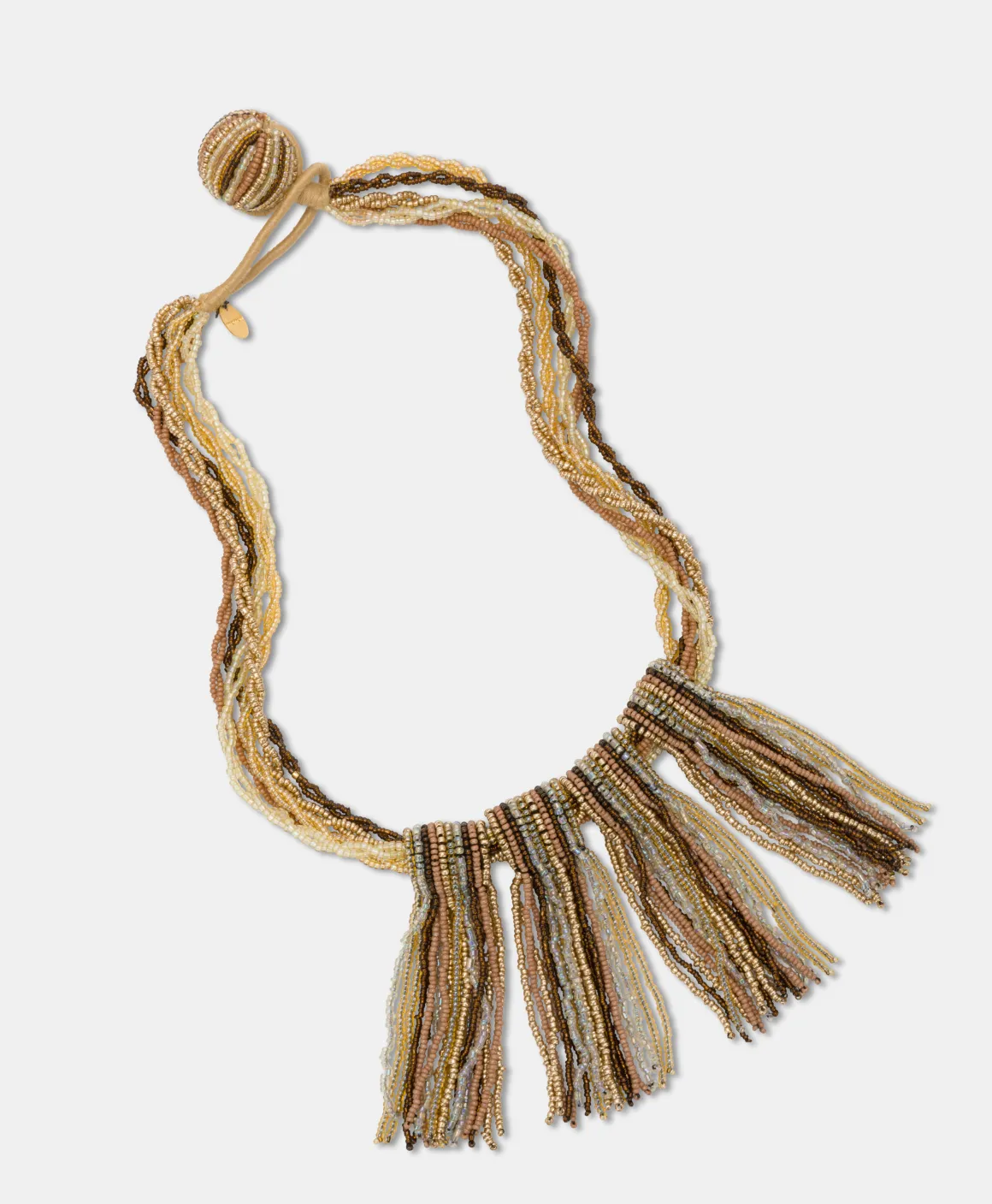 Collana girocollo in file di perline di vetro multicolor a contrasto. Chiusura con pallina ricoperta di perline e cappiolina in filo. Serie di 4 elementi pendenti a frangia sul davanti.