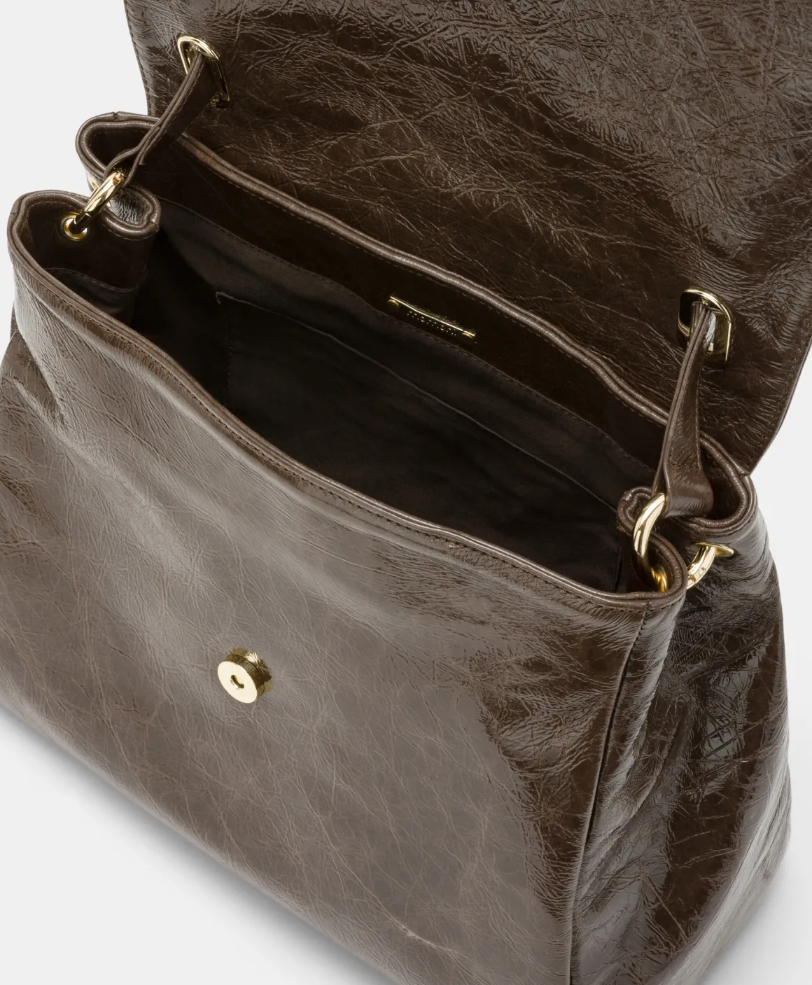 Spirito moderno in una nuova rivisitazione della borsa iconica, realizzata in pelle con trattamento naplack. Patta con raffinato morsetto dorato che sintetizza il logo Momonì, manico a spalla che scompare all’interno degli occhielli a vela e tracolla in pelle removibile. Piedini sul sottoborsa. Costruzione foderata. Made in Italy.