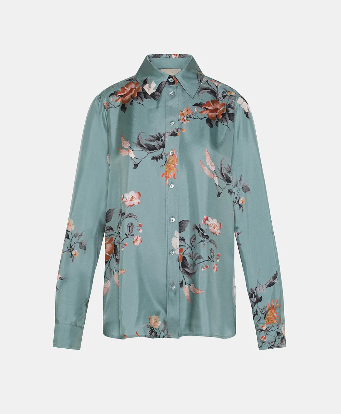 Collo a vela, fondo stondato, abbottonatura a vista e polsi con spacchi profilati e bottoni: un classico della camiceria nelle stampe iconiche di Momonì su twill di pura seta stampato.