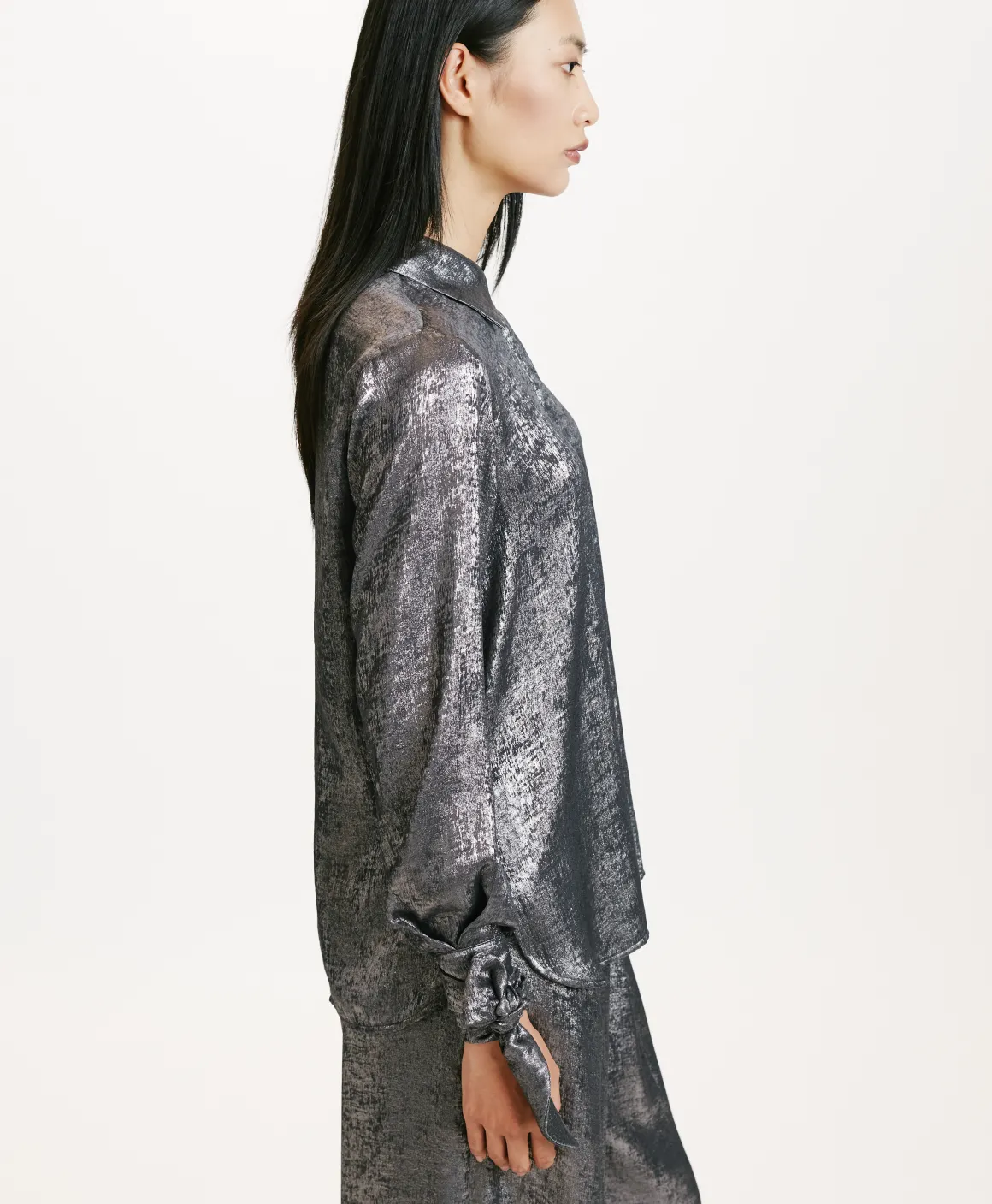 Camicia con collo a vela in tessuto fluido laminato. Elegante abbottonatura a vista e polsi con dettaglio foulard da allacciare in maxi fiocchi.
