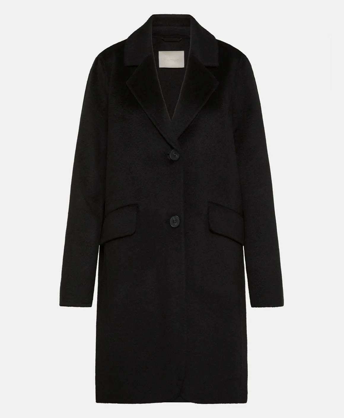 Cappotto corto dalla linea a uovo in panno di lana con pregiata lavorazione double. Chiusura con due bottoni, collo a revêres e tasche a pattina inclinata. Costruzione sfoderata.