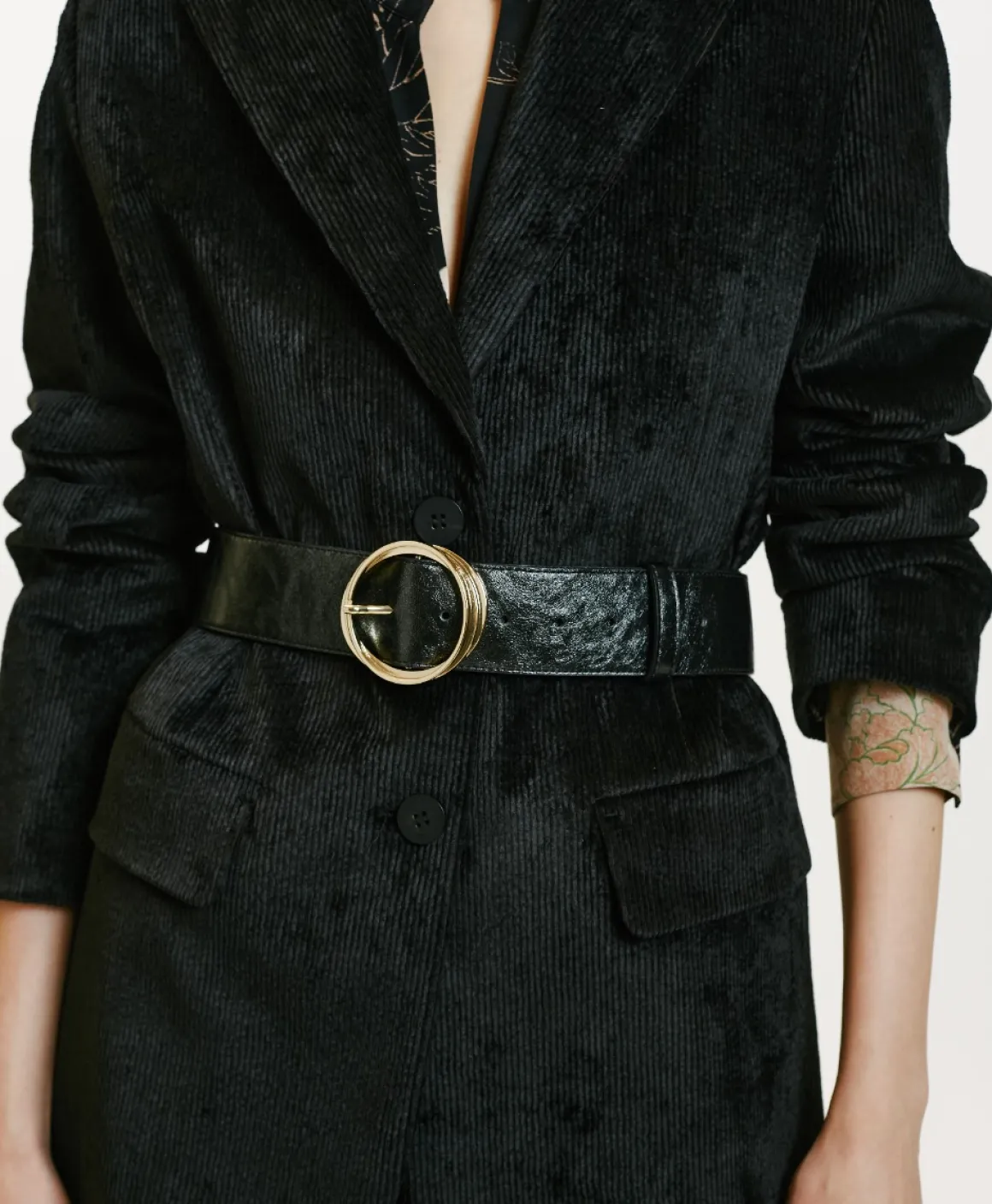Cintura in ecopelle laminata, con fibbia tonda, galvanica oro chiaro.