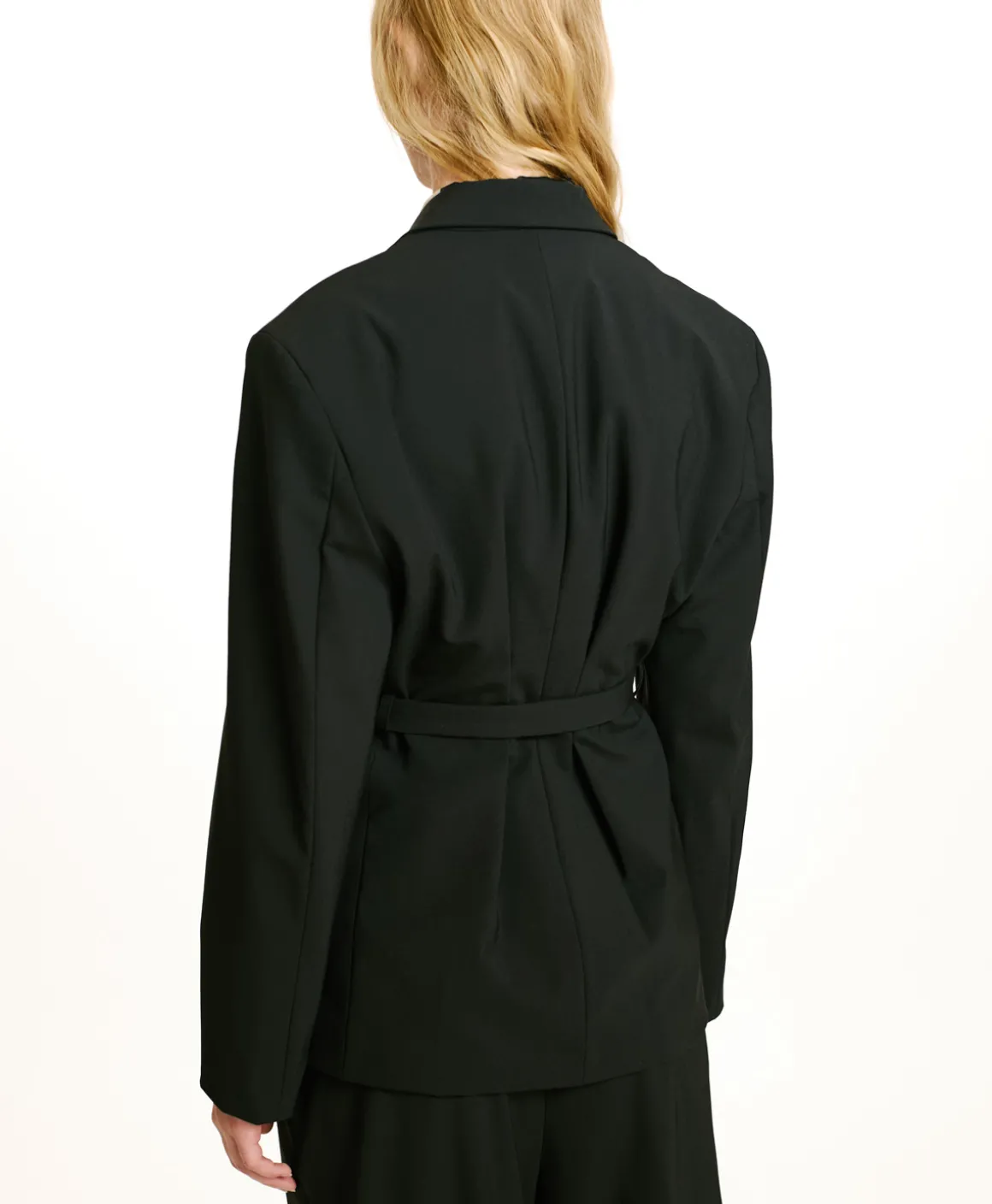 Giacca in fresco di lana bi-stretch dalla linea scultorea e sartoriale. Larghe spalline a “uomo” e sciancratura in vita, con riprese sul davanti e sul dietro. Fondo stondato e dettaglio cinturino decorativo con bottoni sulla schiena. Costruzione foderata.