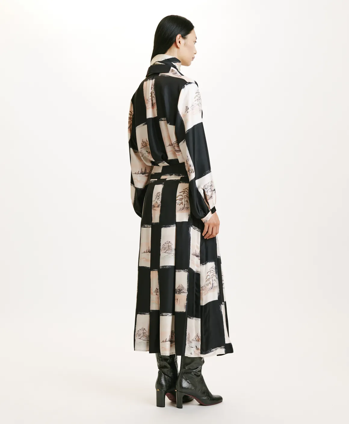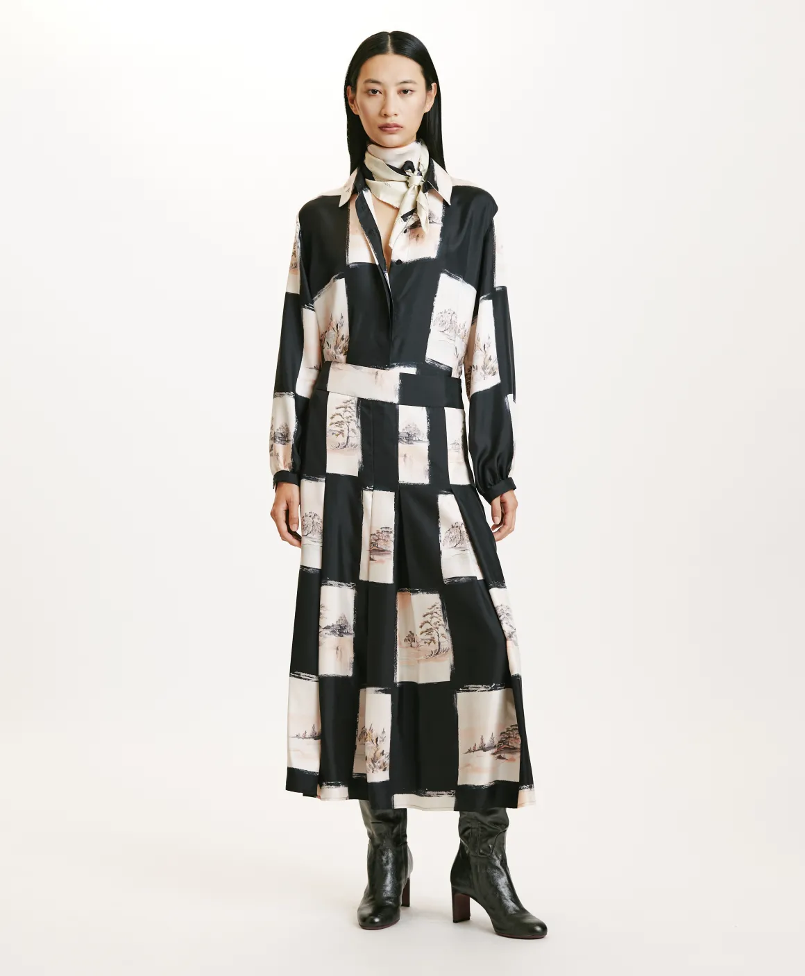 Femminile gonna in twill di pura seta stampato, con inserimento sul davanti e sul dietro di pieghe dall’aspetto sartoriale. Tasche alla Francese e zip sul fianco.