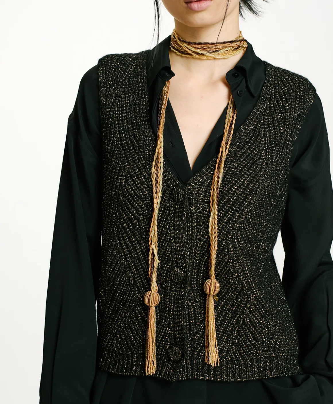 Gilet corto con abbottonatura con due bottoni e scollo a “v”. Realizzato in particolare lavorazione a treccia in filato soffice misto lana vergine con tocchi di lurex Made in Italy.