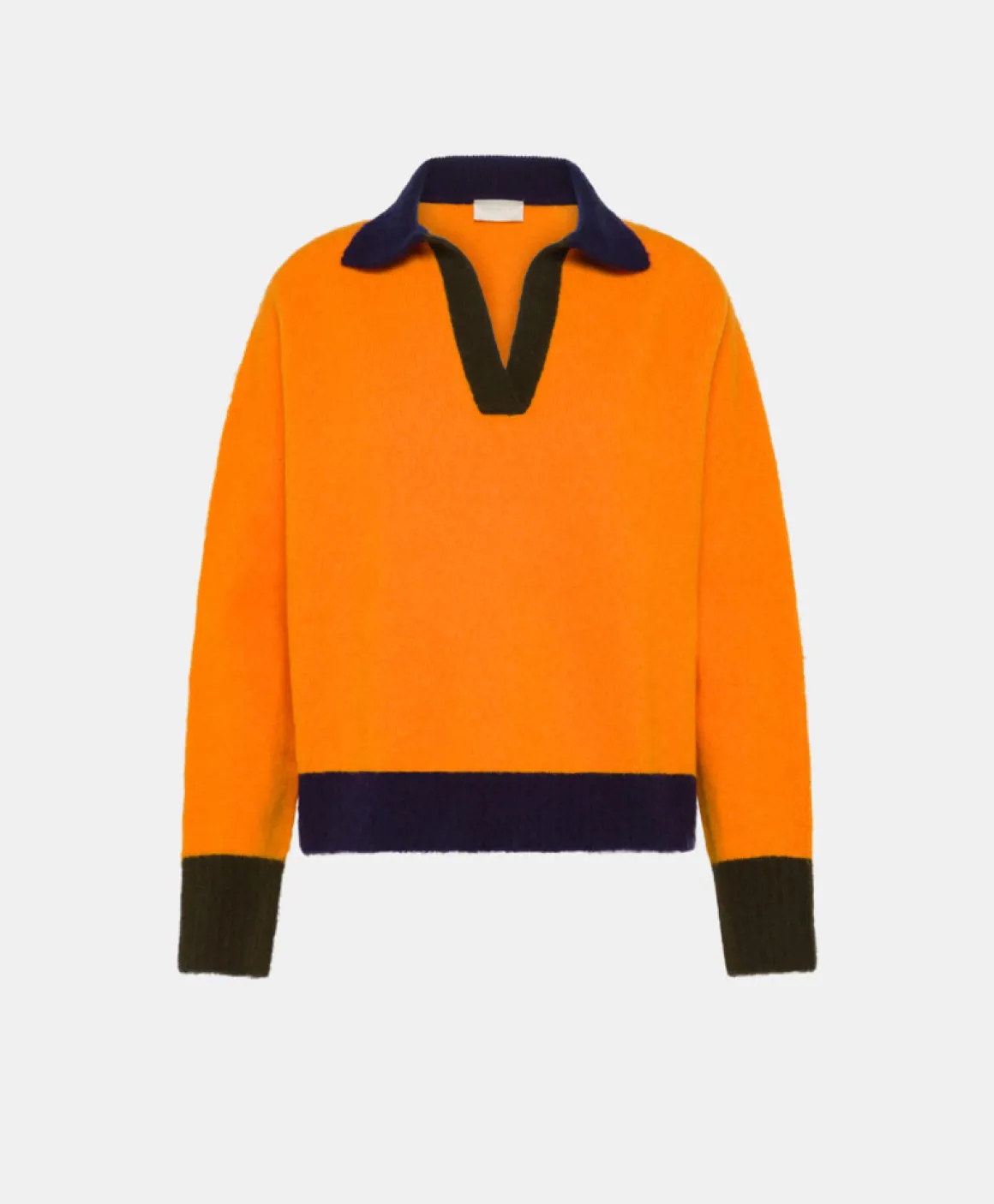maglia con collo a polo in filato di lana elasticizzata effetto felpa. Particolare gioco di colori a contrasto, a formare dei blocchi sul collo, sui fondi e sui fianchi. Rifiniture a coste alte. Made in Italy