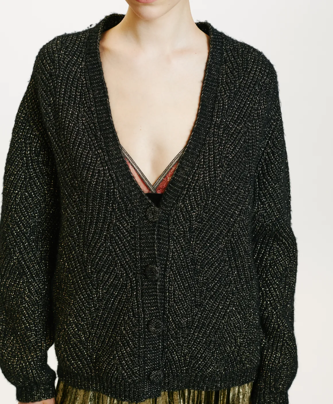Cardigan effetto boxy in filato lana Vergine. Maniche lunghe, scollattura a “v”, senza bottoni con rifinitura a coste sul fondo. Particolare lavorazione a treccia con un tocco di lurex.