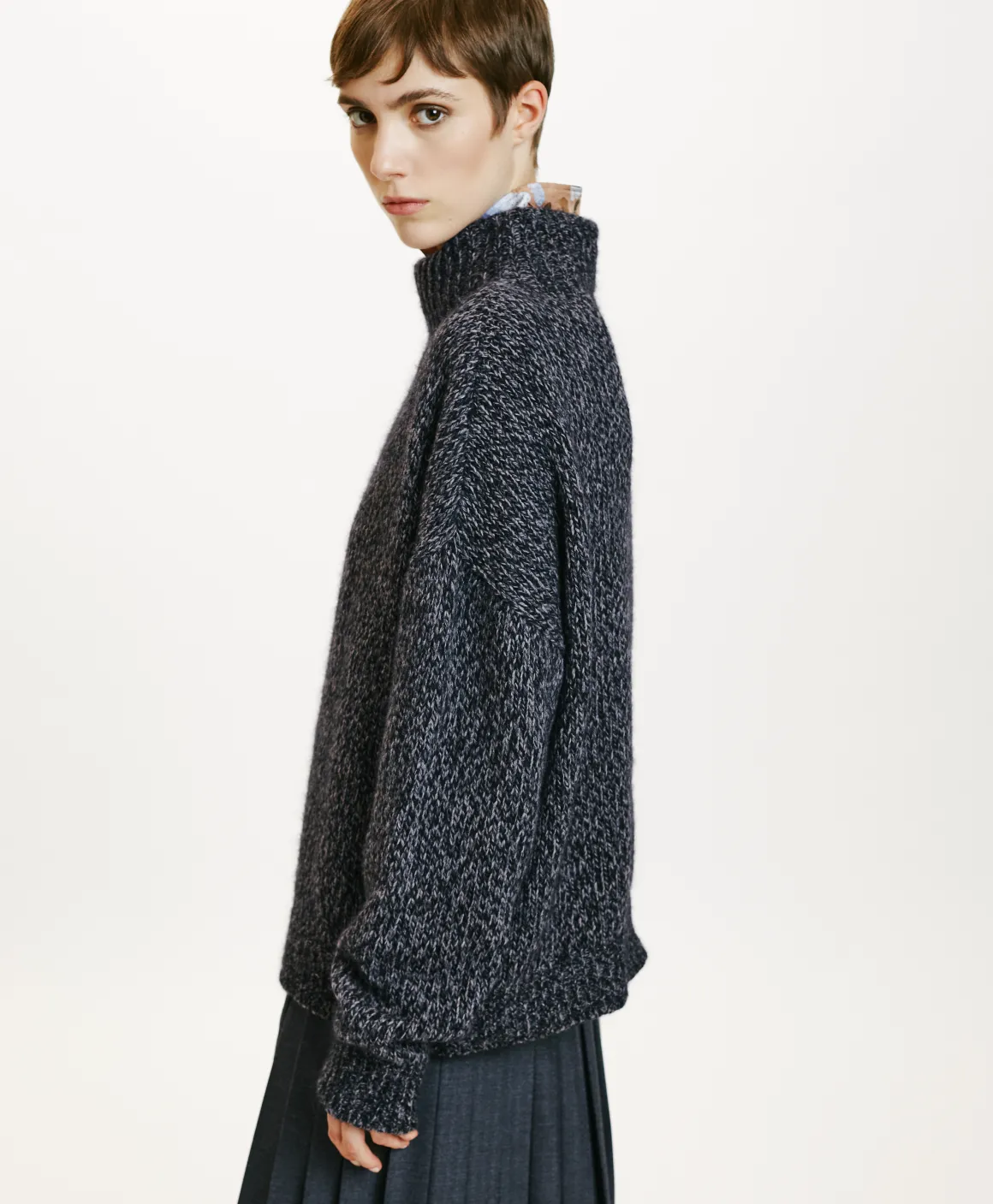 Maglia in misto lana , effetto moulinè. Collo alto, maniche lunghe dalla vestibilità morbida. Made in Italy