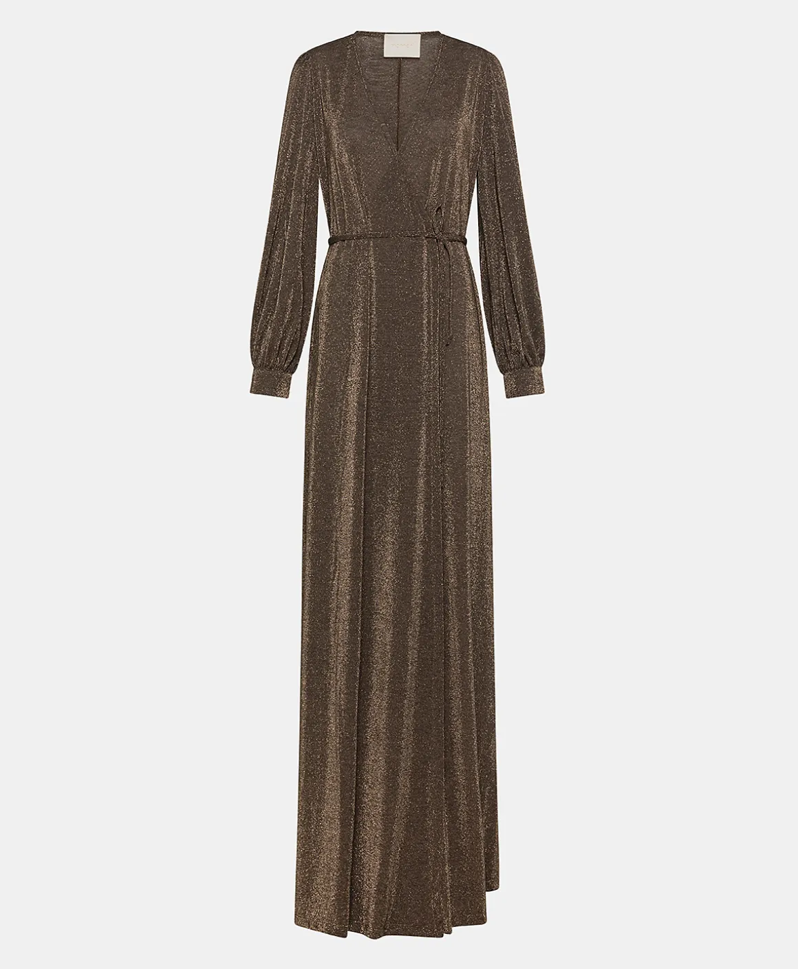 Abito lungo in jersey lurex incrociato con scollo profondo e maniche lunghe, pensato per le occasioni speciali.