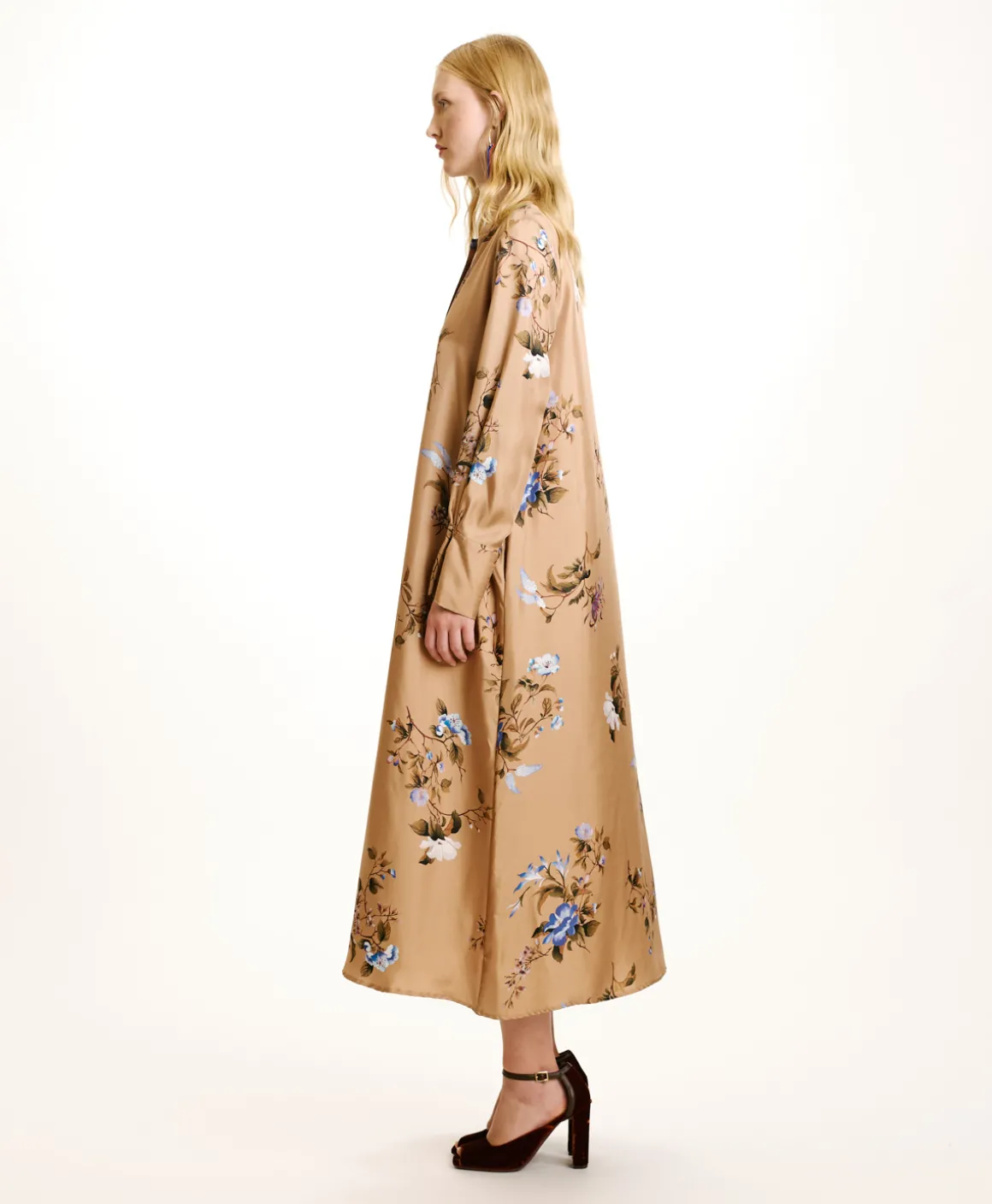 Versatile abito lungo in twill di pura seta stampato con scollo dalla linea a “v”, apertura a polo chiusa con asole e bottoni e manica lunga, con polso arricciato al fondo. Una piega sotto la scollatura dona movimento alla silouhette di Yui.