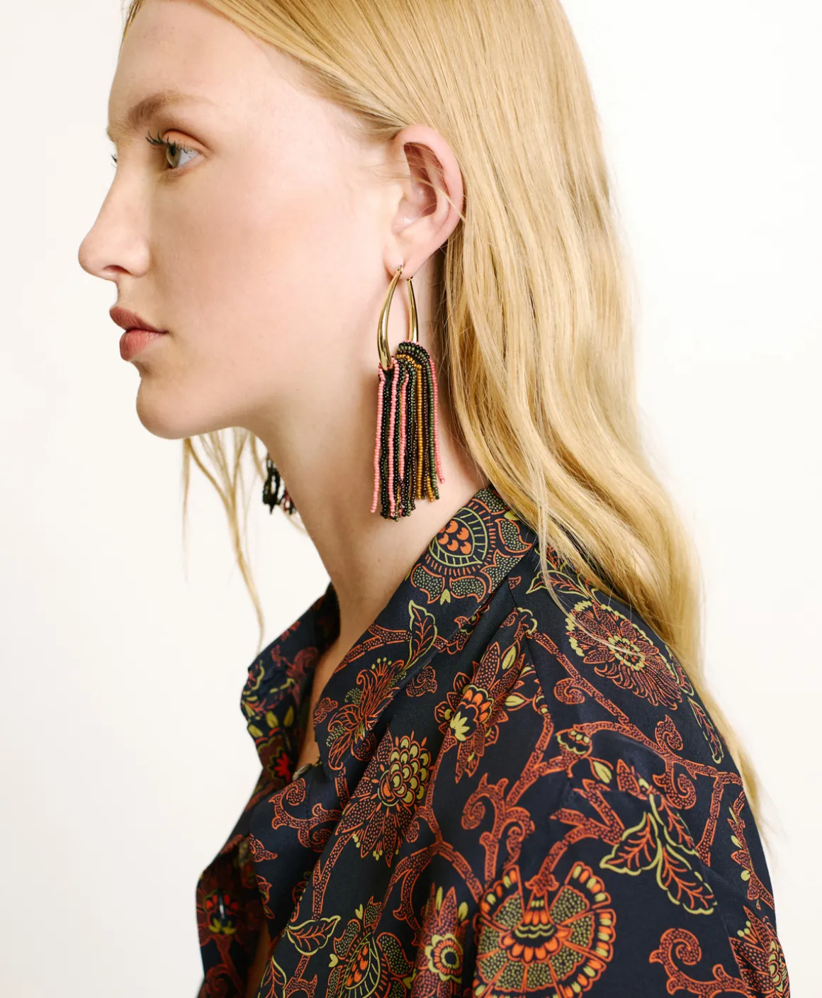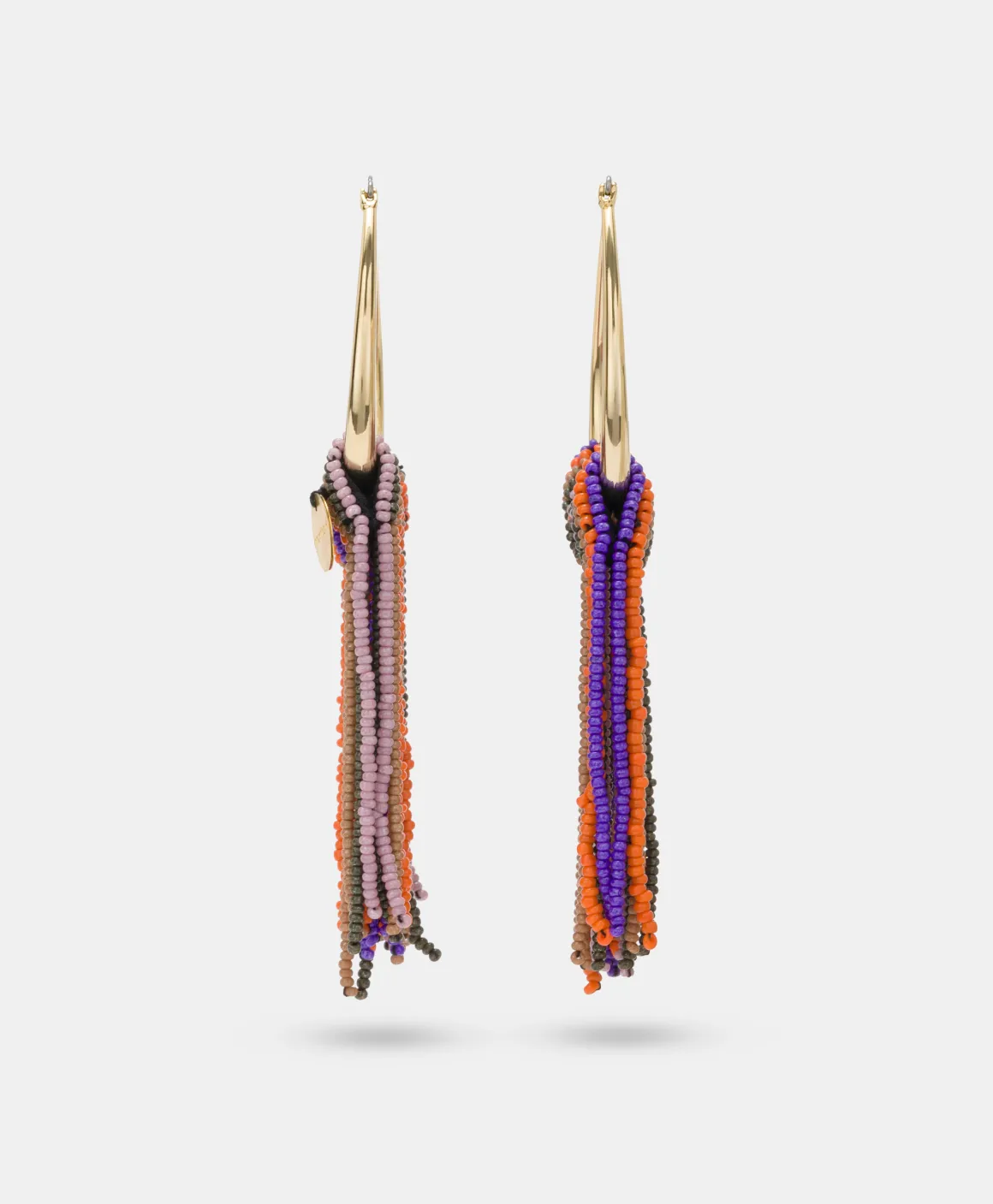 Orecchini pendenti con maxi anella a goccia in metallo dorato e fili di perline di vetro multicolor a contrasto.