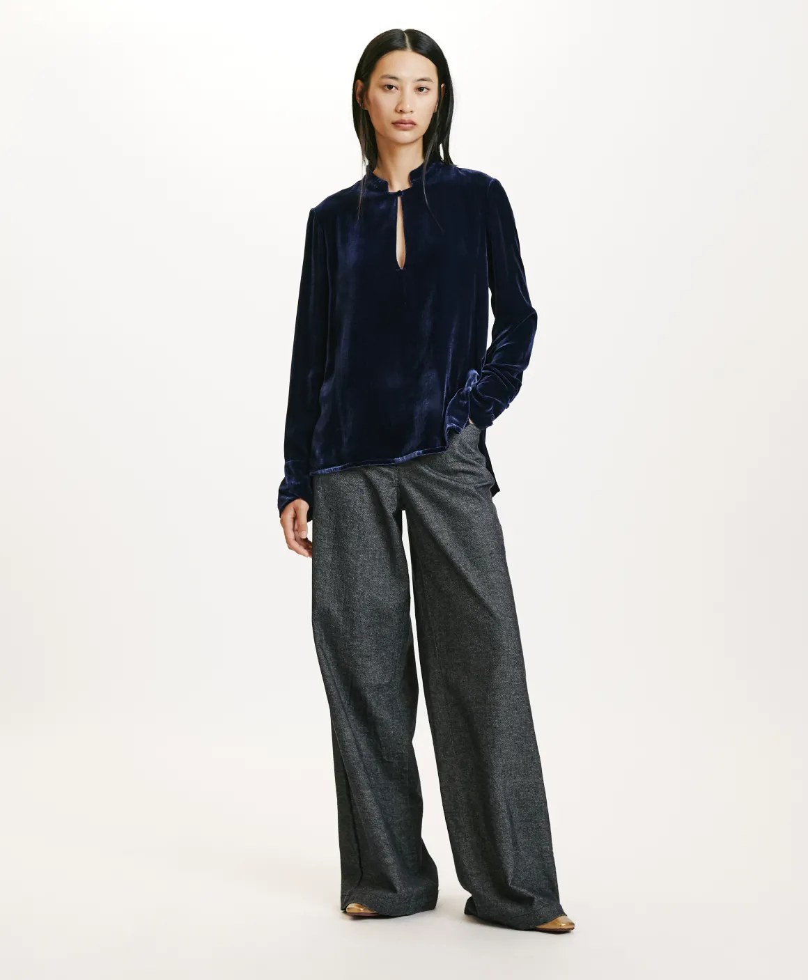 Blusa manica lunga in prezioso velluto di seta e viscosa. Piccolo colletto alla coreana e apertura a goccia chiusa da bottoncino ricoperto di tessuto. Polso alto con dettaglio piega a soffietto chiusa da bottone e asolina.
