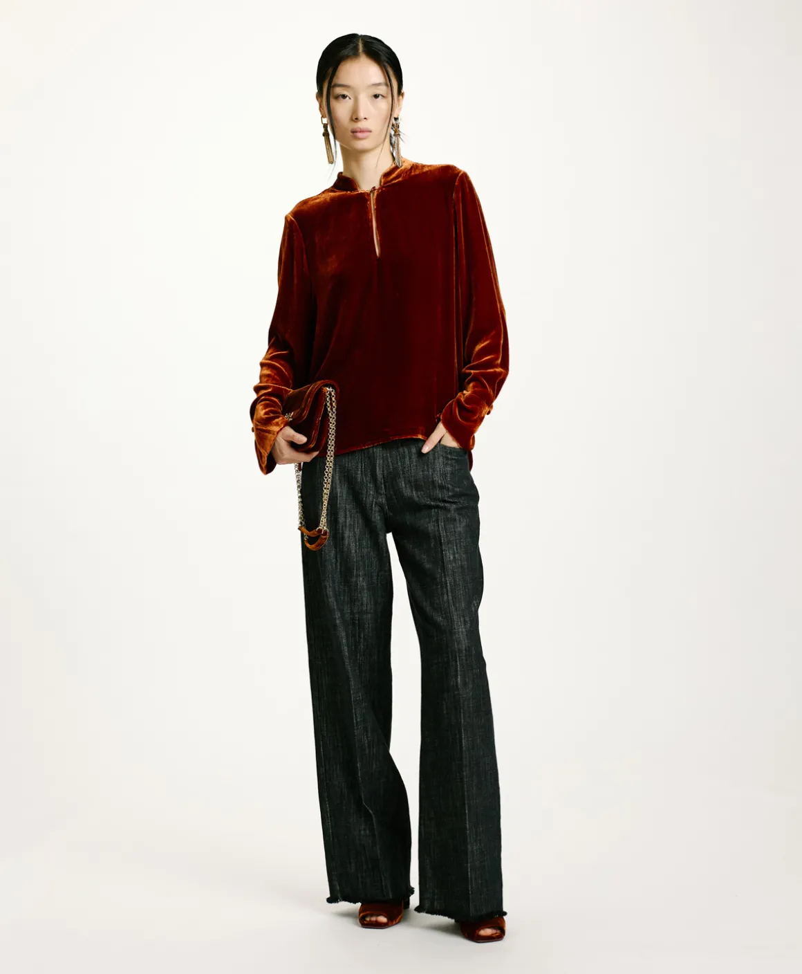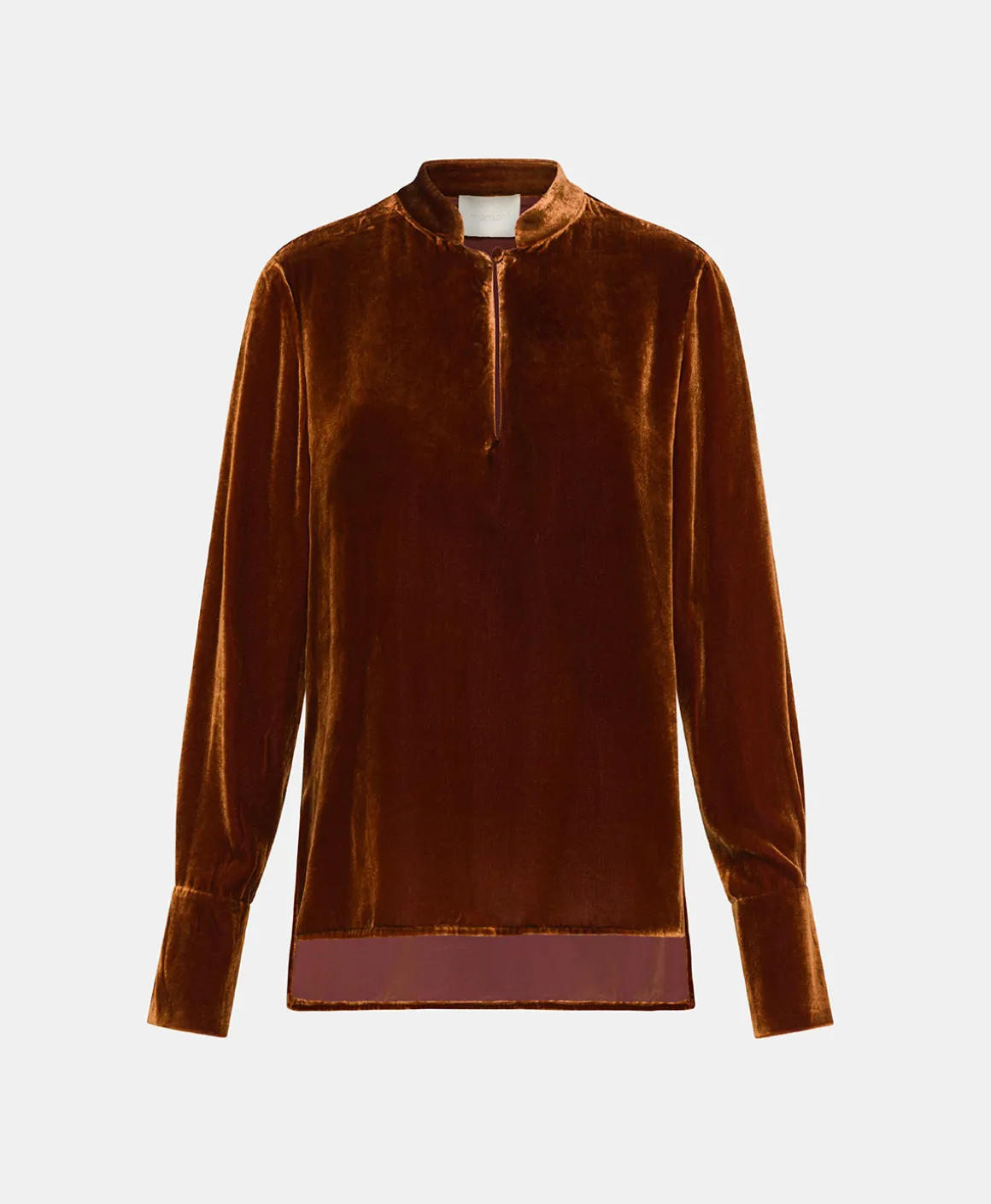 Blusa manica lunga in prezioso velluto di seta e viscosa. Piccolo colletto alla coreana e apertura a goccia chiusa da bottoncino ricoperto di tessuto. Polso alto con dettaglio piega a soffietto chiusa da bottone e asolina.