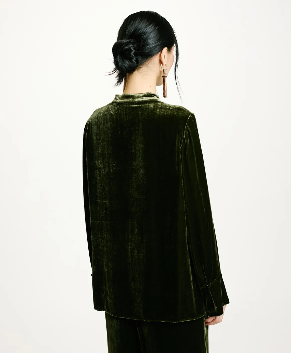 Blusa manica lunga in prezioso velluto di seta e viscosa. Piccolo colletto alla coreana e apertura a goccia chiusa da bottoncino ricoperto di tessuto. Polso alto con dettaglio piega a soffietto chiusa da bottone e asolina.