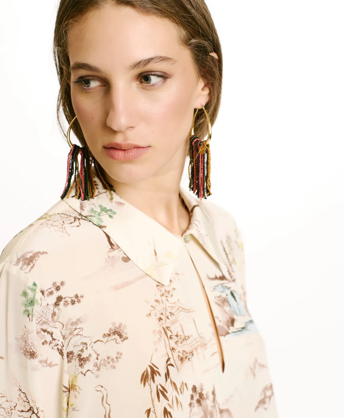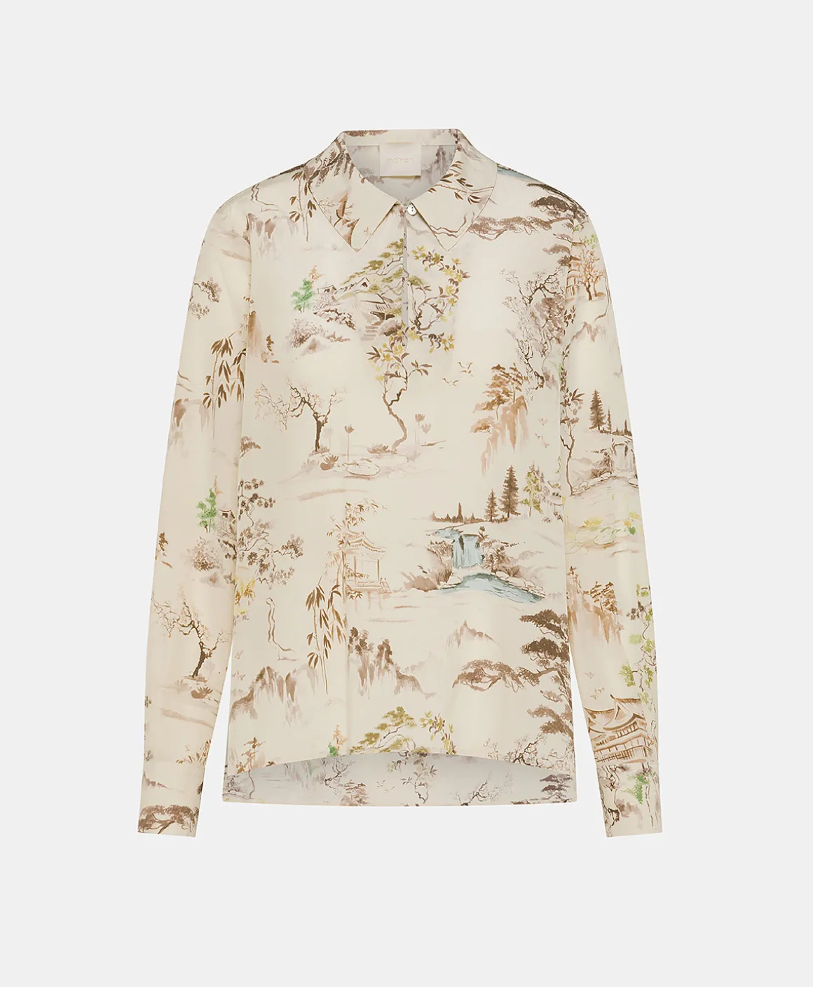 Blusa con apertura centrale a goccia e collo a vela chiuso da bottoncino madreperla, in seta crepe de chine stampato. Manica lunga con polso a uomo con pieghe, spacchi laterali e dettaglio del dietro più lungo rispetto al davanti.