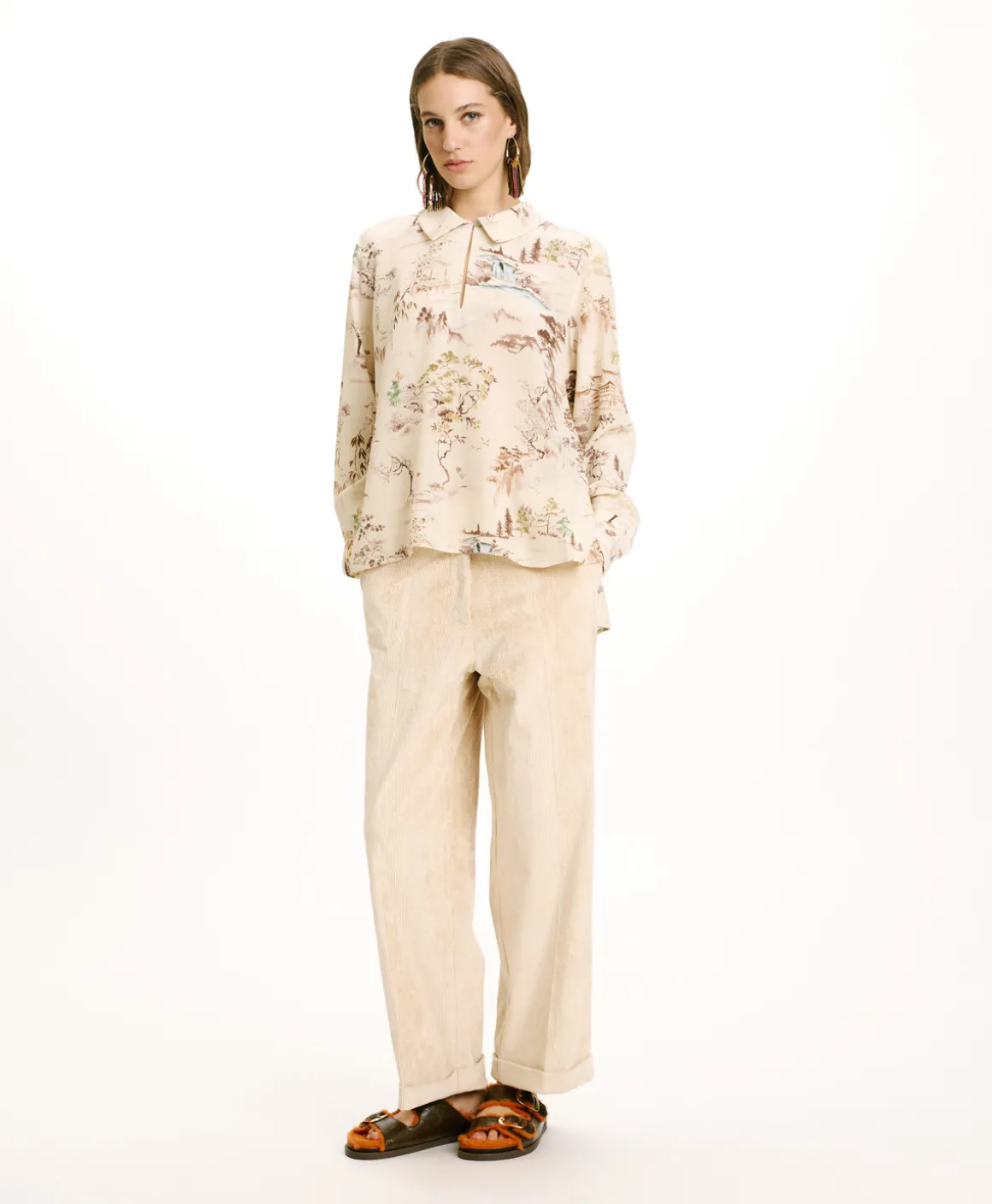 Blusa con apertura centrale a goccia e collo a vela chiuso da bottoncino madreperla, in seta crepe de chine stampato. Ma…
