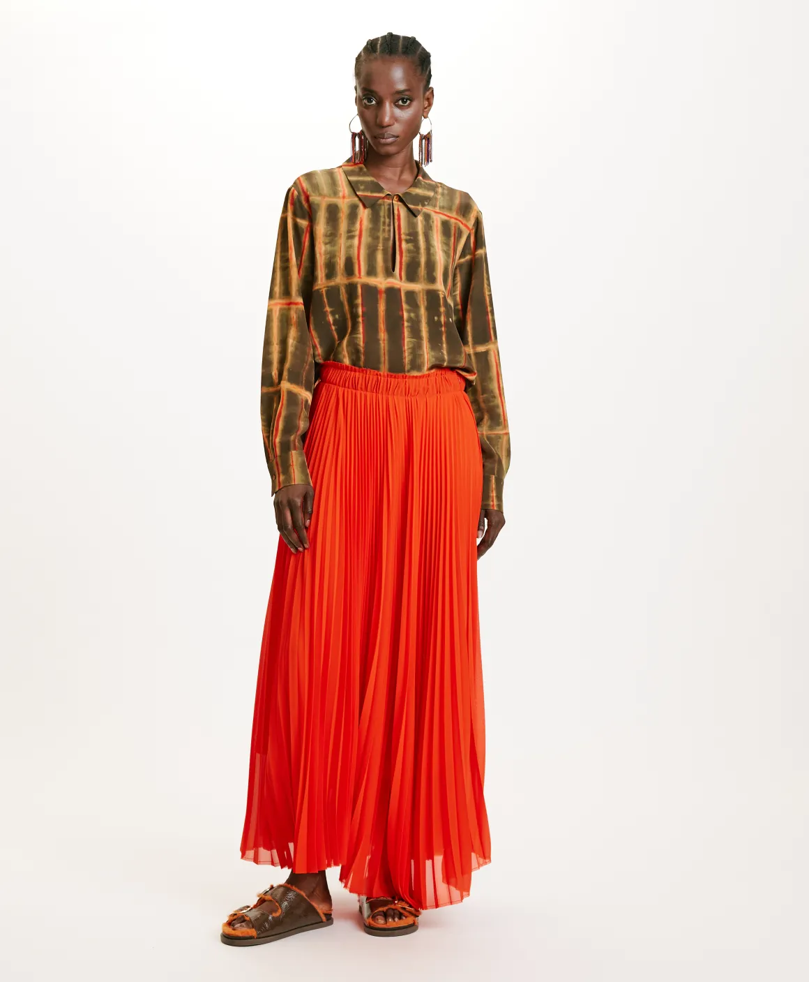 Blusa con apertura centrale a goccia e collo a vela chiuso da bottoncino madreperla, in seta crepe de chine stampato. Manica lunga con polso a uomo con pieghe, spacchi laterali e dettaglio del dietro più lungo rispetto al davanti.