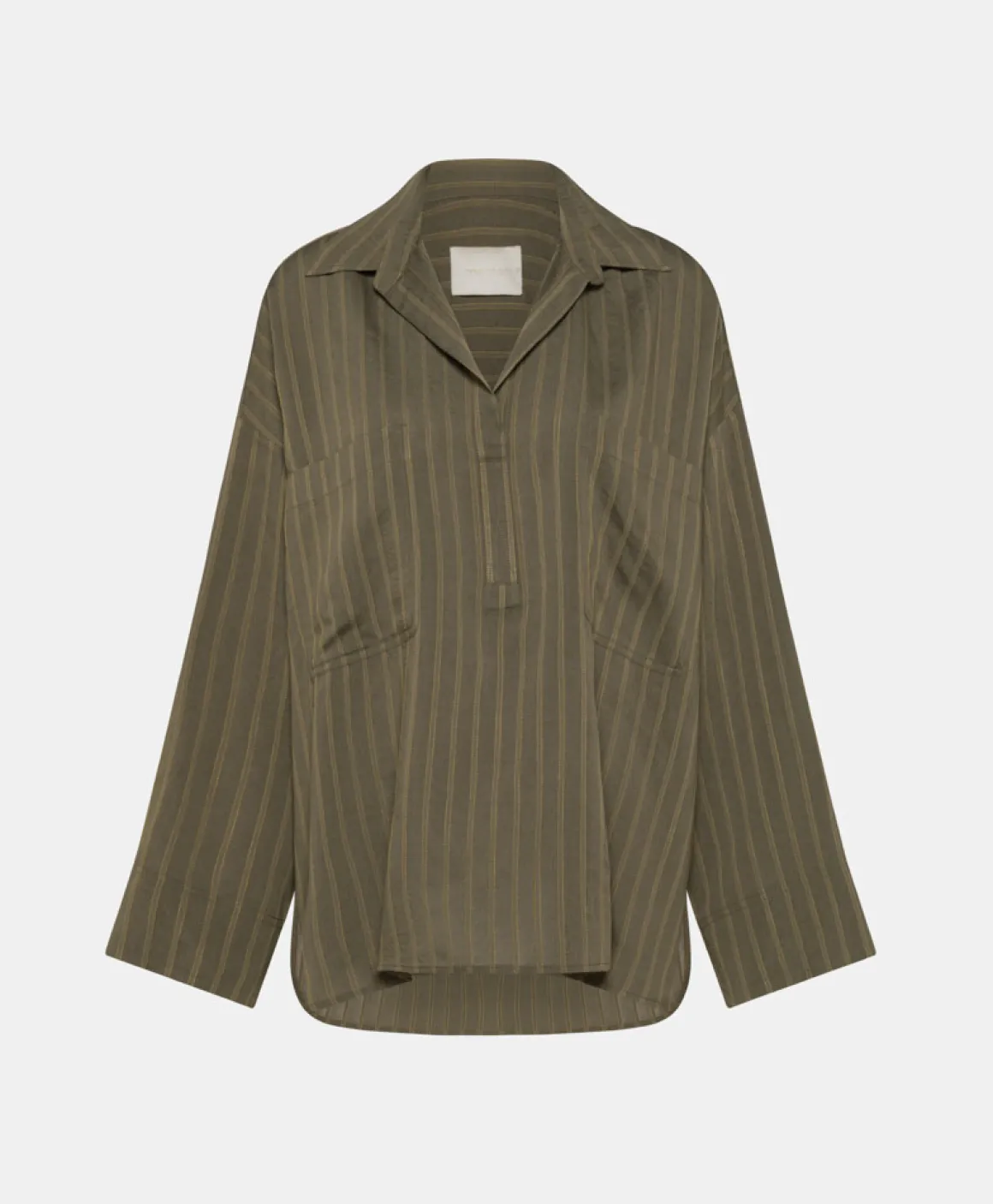 Maxi blusa in popeline operato con disegno gessato. Collo aperto con polo senza bottoni e grandi tasconi applicati. Fondo stondato con spacchi che seguono la linea tonda, manica dritta ampia risvoltabile e carrè dietro con passantone.