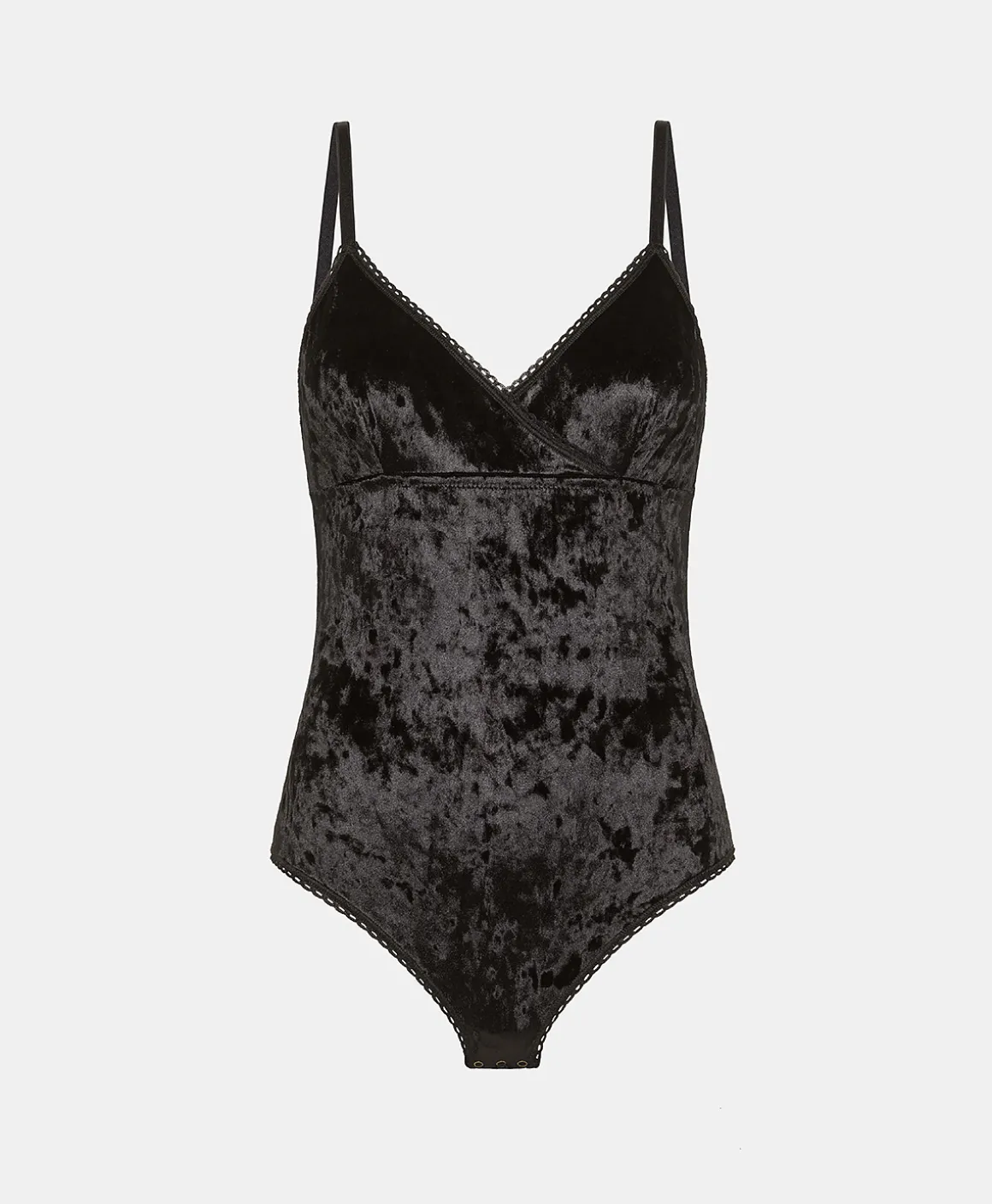 Body carry-over realizzato nella versione invernale e festiva in morbido velluto stretch. Tore ha coppe a triangolo leggermente incrociate sul davanti, rifinite da cappette elasticizzate e fiocchetti a contrasto. Sottili spalline e gancetti regolabili sul cavallo. Made in Italy.