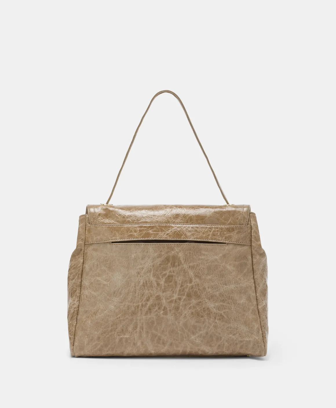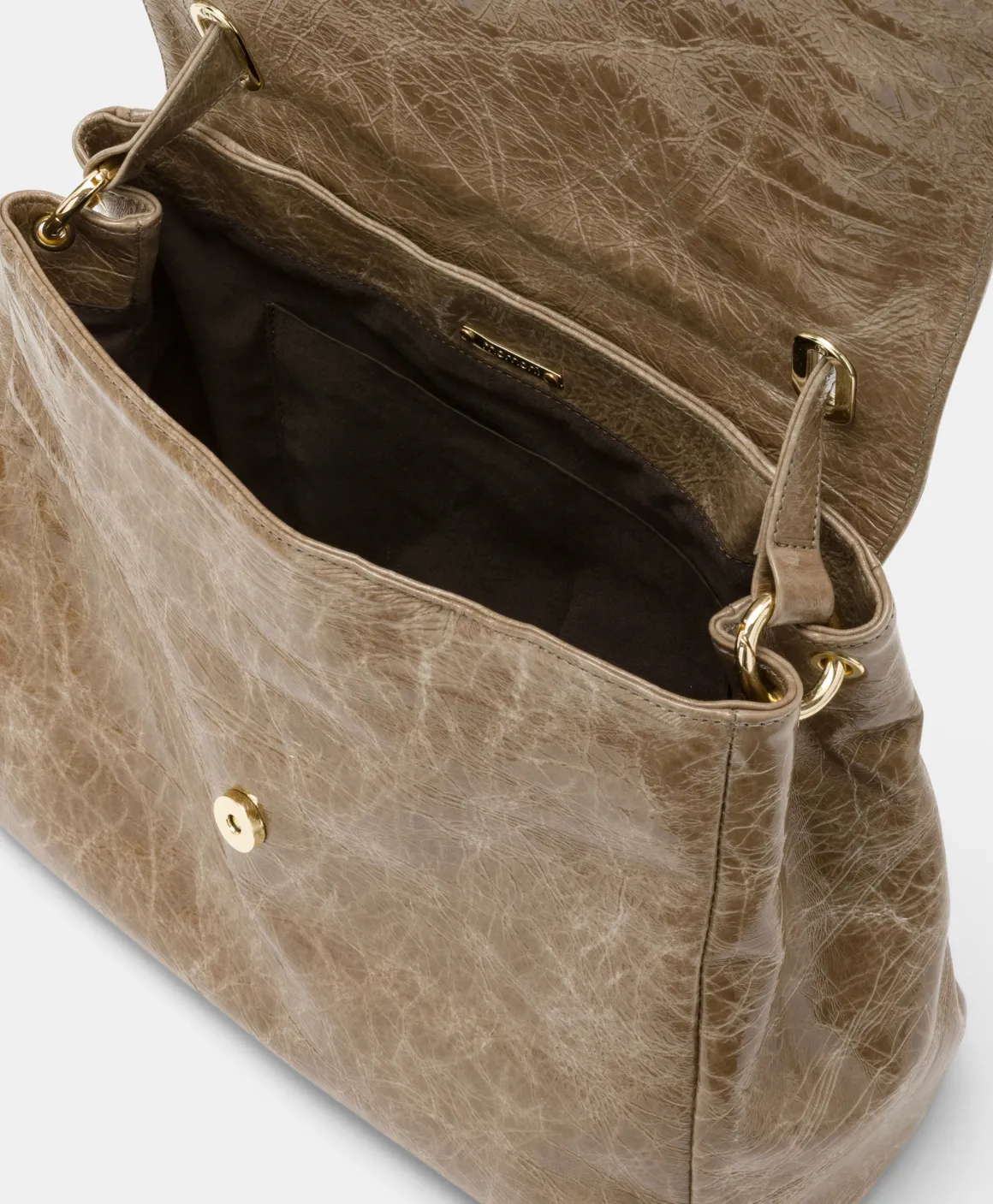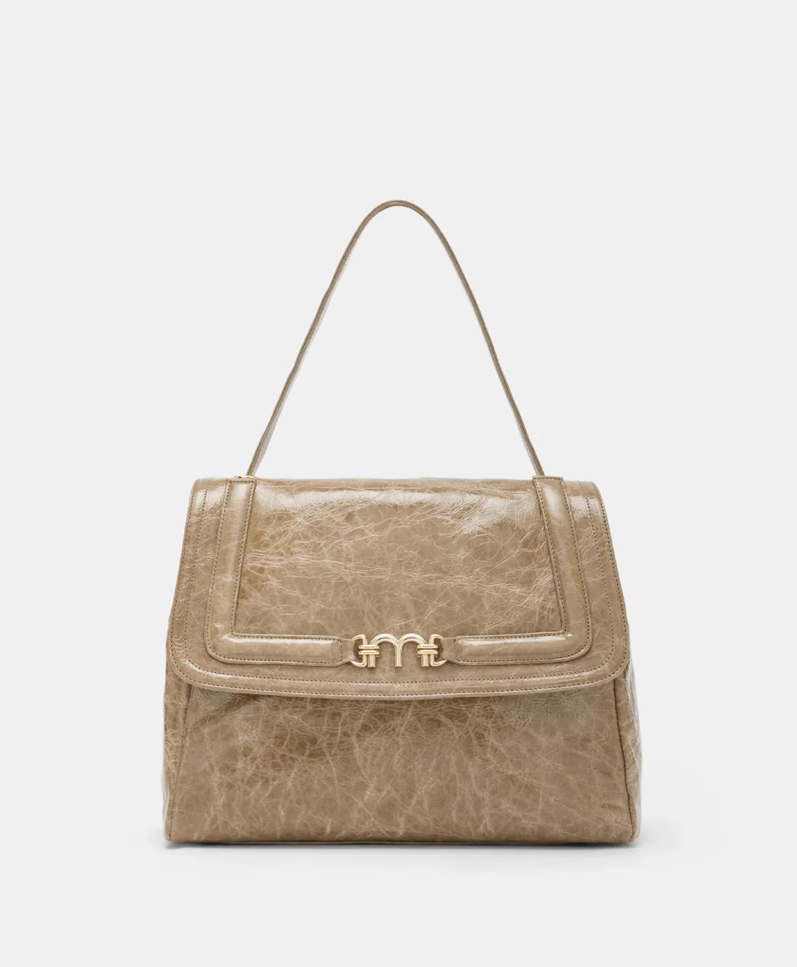 Spirito moderno in una nuova rivisitazione della borsa iconica, realizzata in pelle con trattamento naplack. Patta con raffinato morsetto dorato che sintetizza il logo Momonì, manico a spalla che scompare all’interno degli occhielli a vela e tracolla in pelle removibile. Piedini sul sottoborsa. Costruzione foderata. Made in Italy.