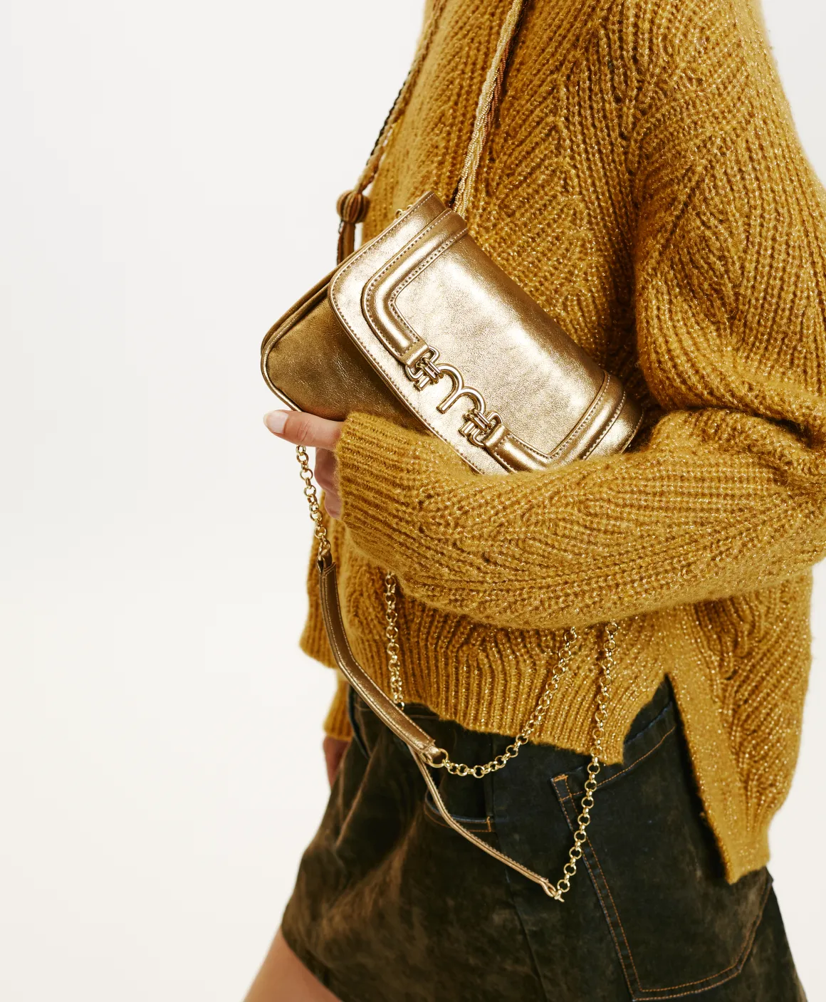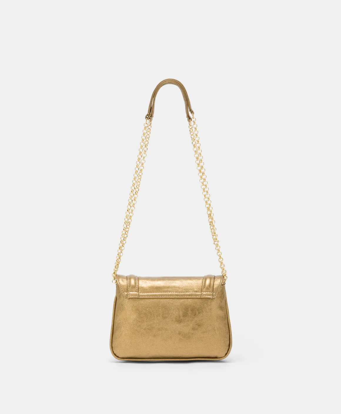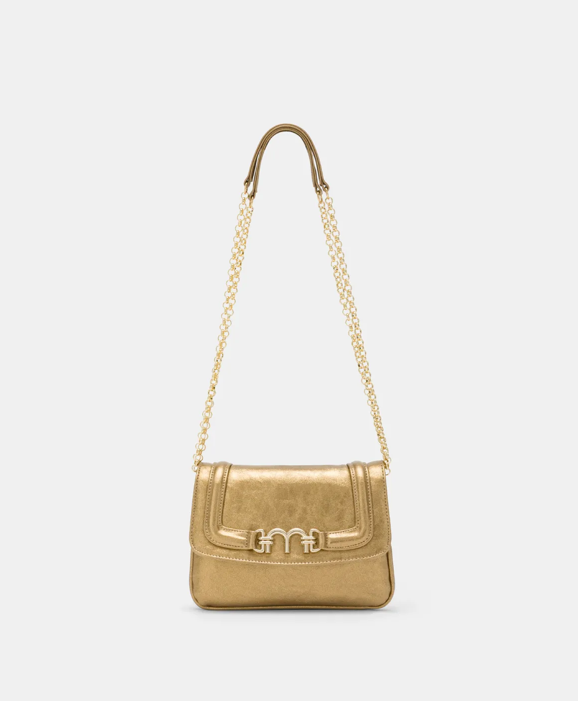 Mimì, la “piccolina” della linea Flore, è una raffinata pochette presentata nella nuova versione a due soffietti in ecopelle laminata. Pattina con distintivo morsetto Momonì dorato, tracolla in catena regolabile con poggia spalla, taschini interni chiusi da zip e bottoni. Made in Italy.