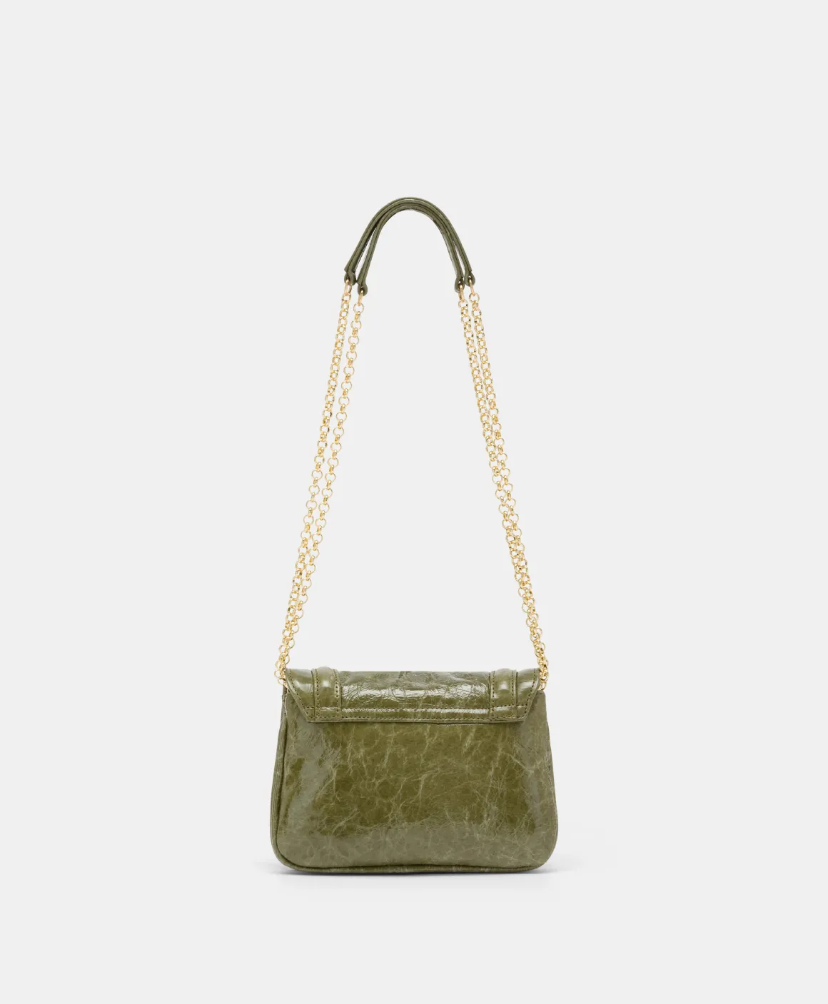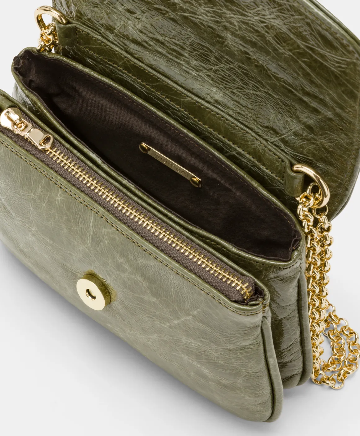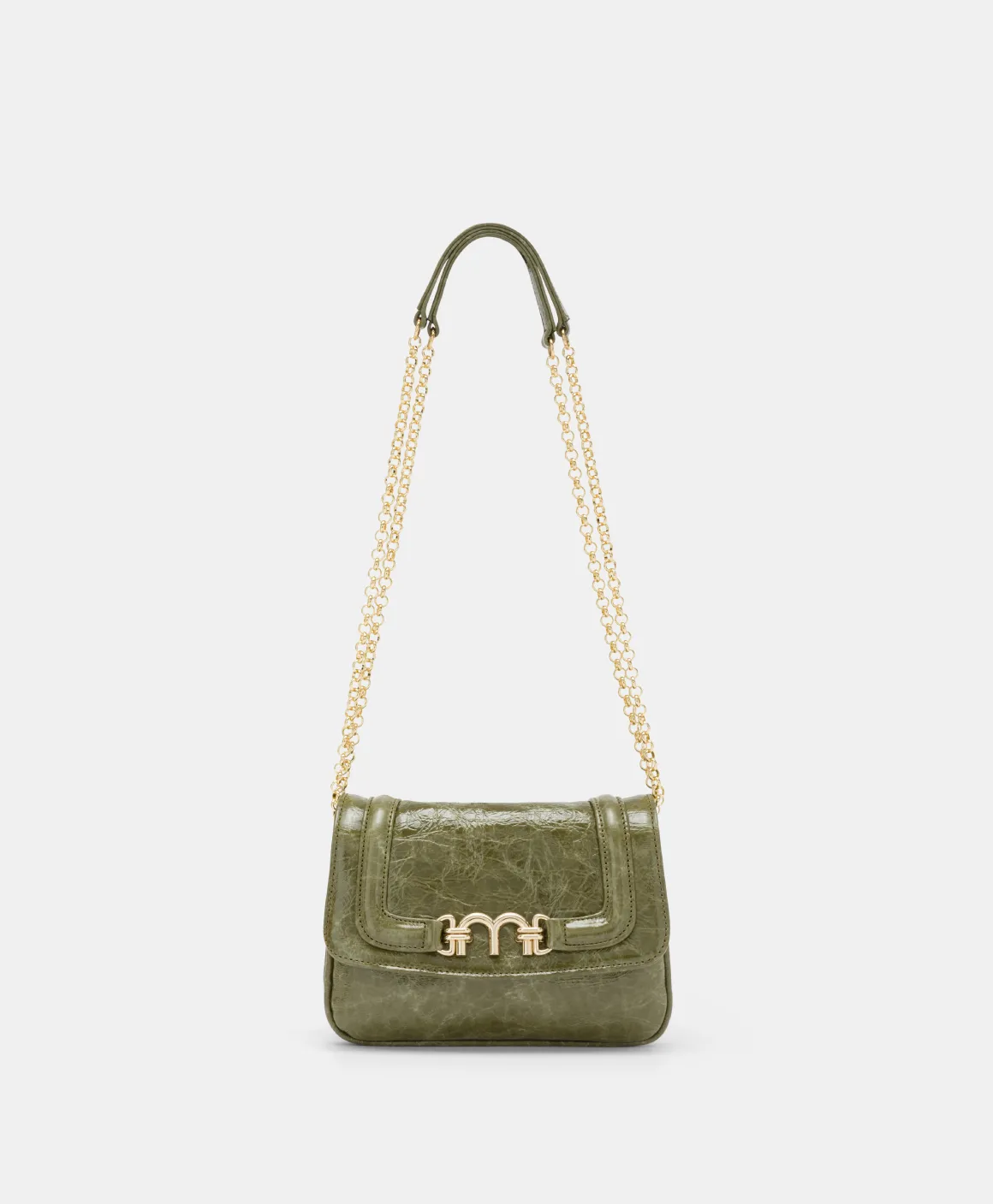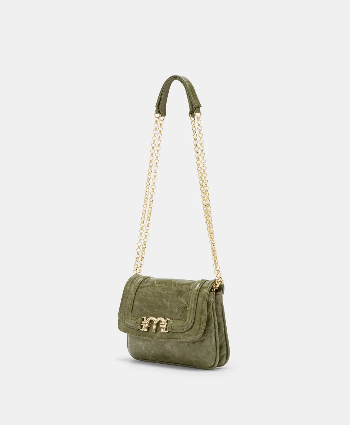 Mimì, la “piccolina” della linea Flore, è una raffinata pochette presentata nella nuova versione a due soffietti in pelle con trattamento naplack. Pattina con distintivo morsetto Momonì dorato, tracolla in catena regolabile con poggia spalla, taschini interni chiusi da zip e bottoni. Made in Italy.