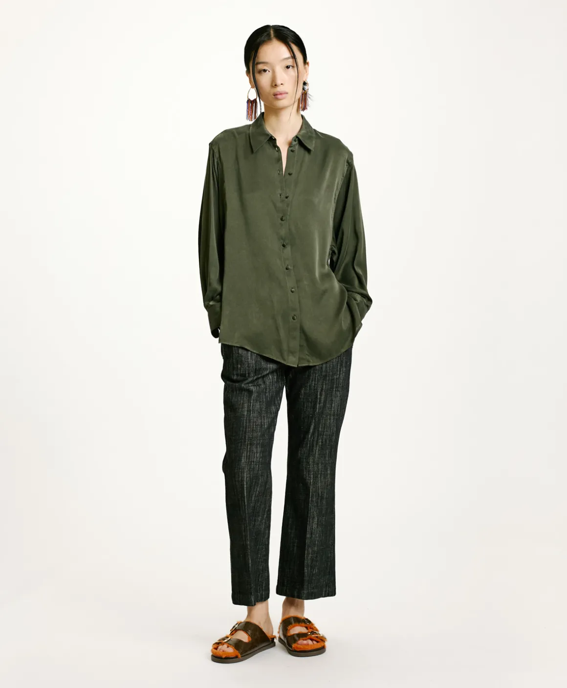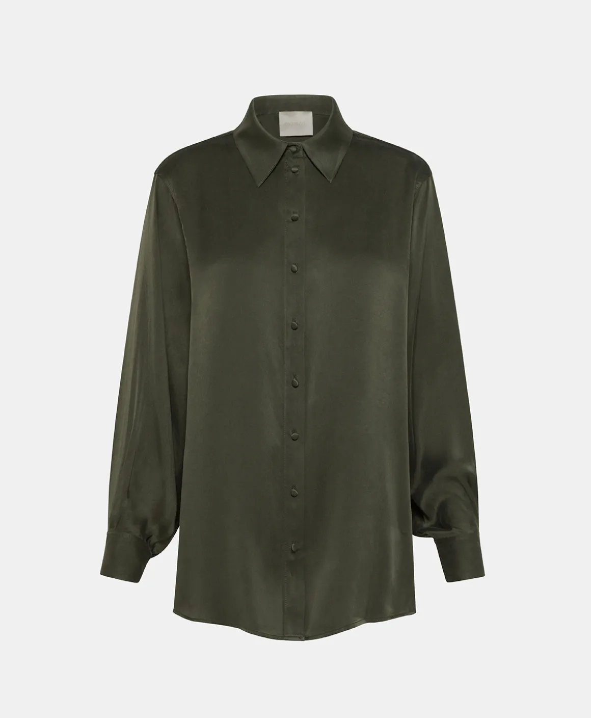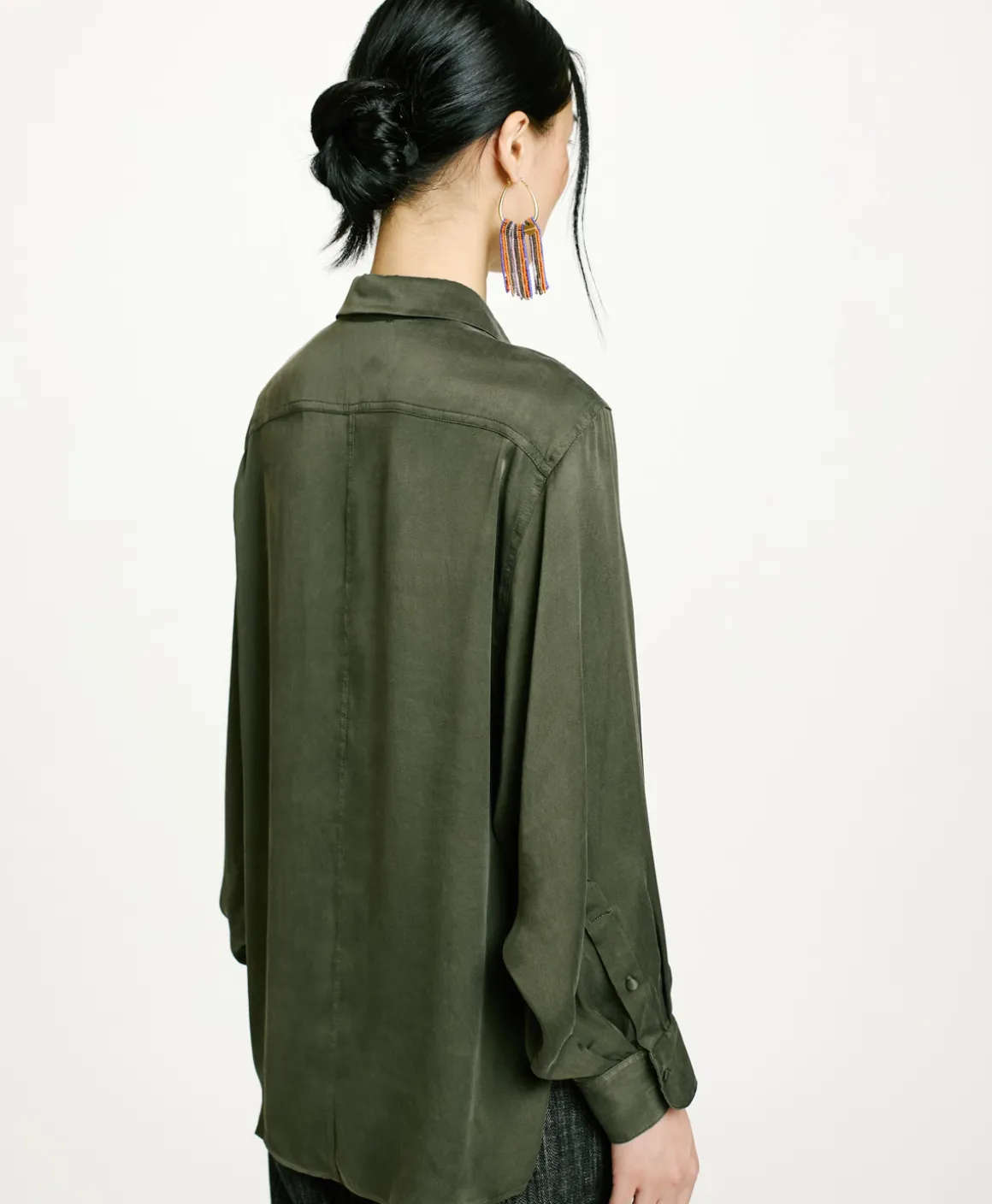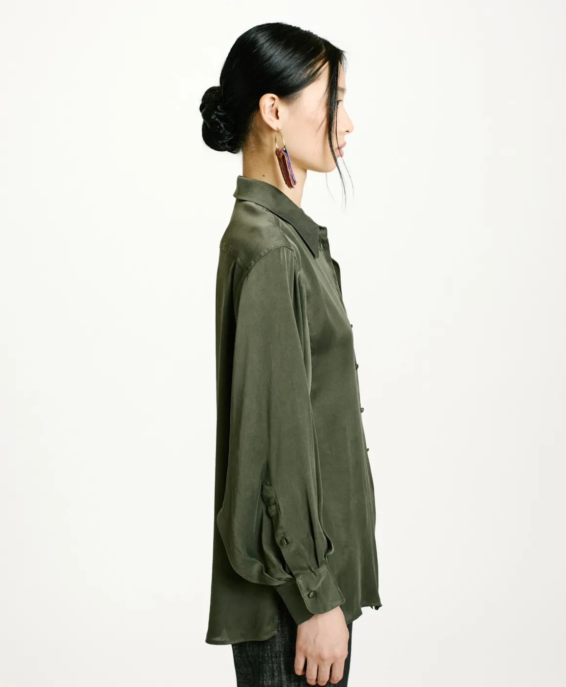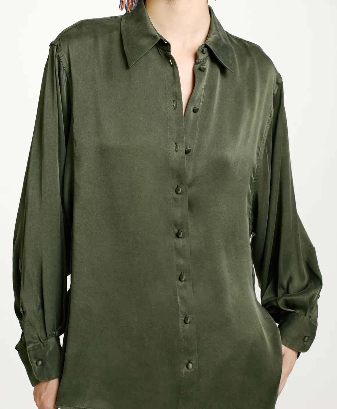 Camicia oversize in pregiata seta dalla mano pesca. Speciale ampia manica con giro basso che chiude sul polso con bottone. Abbottonatura a vista e colletto a vela.