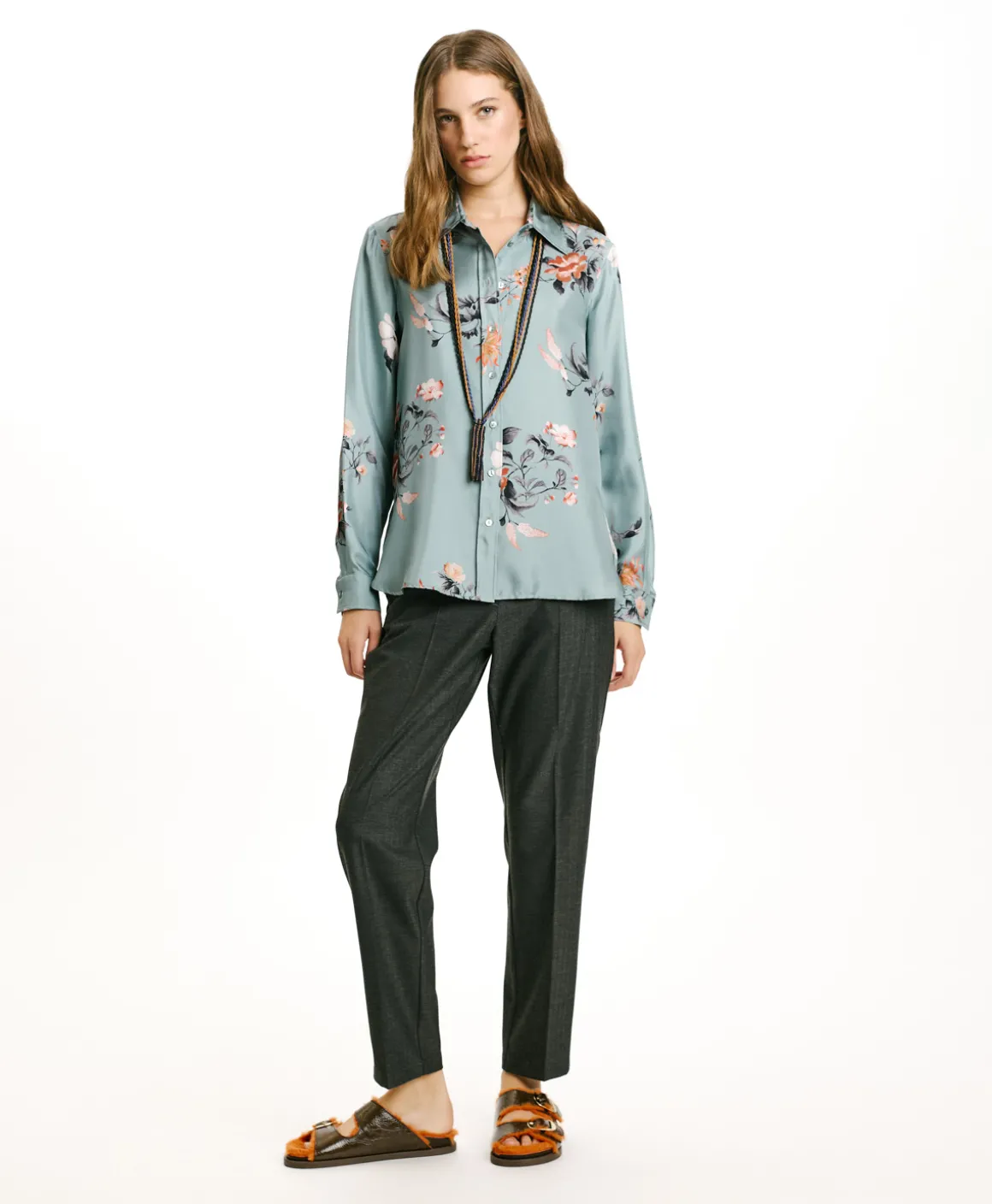 Collo a vela, fondo stondato, abbottonatura a vista e polsi con spacchi profilati e bottoni: un classico della camiceria nelle stampe iconiche di Momonì su twill di pura seta stampato.