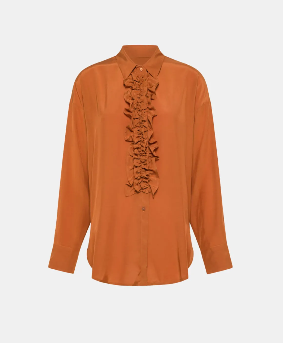 Maxi camicia carry-over in viscosa fluida. Polsi alti, collo a vela sceso e ricche rouches completano lo stile rock-cool…