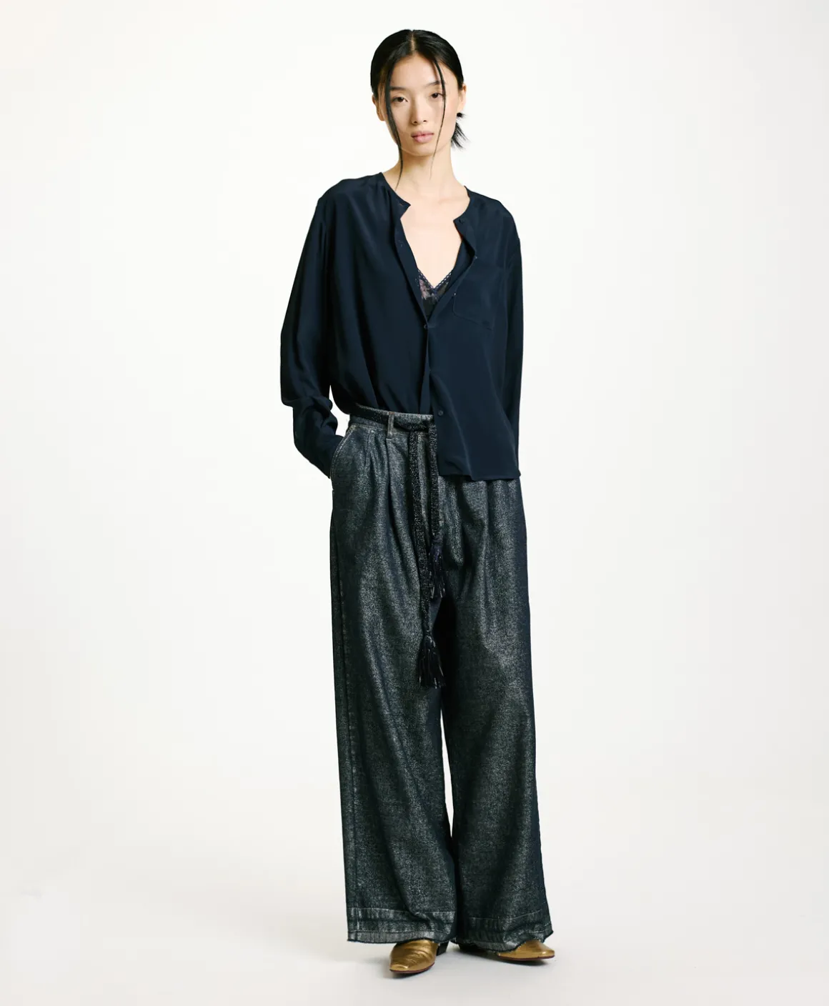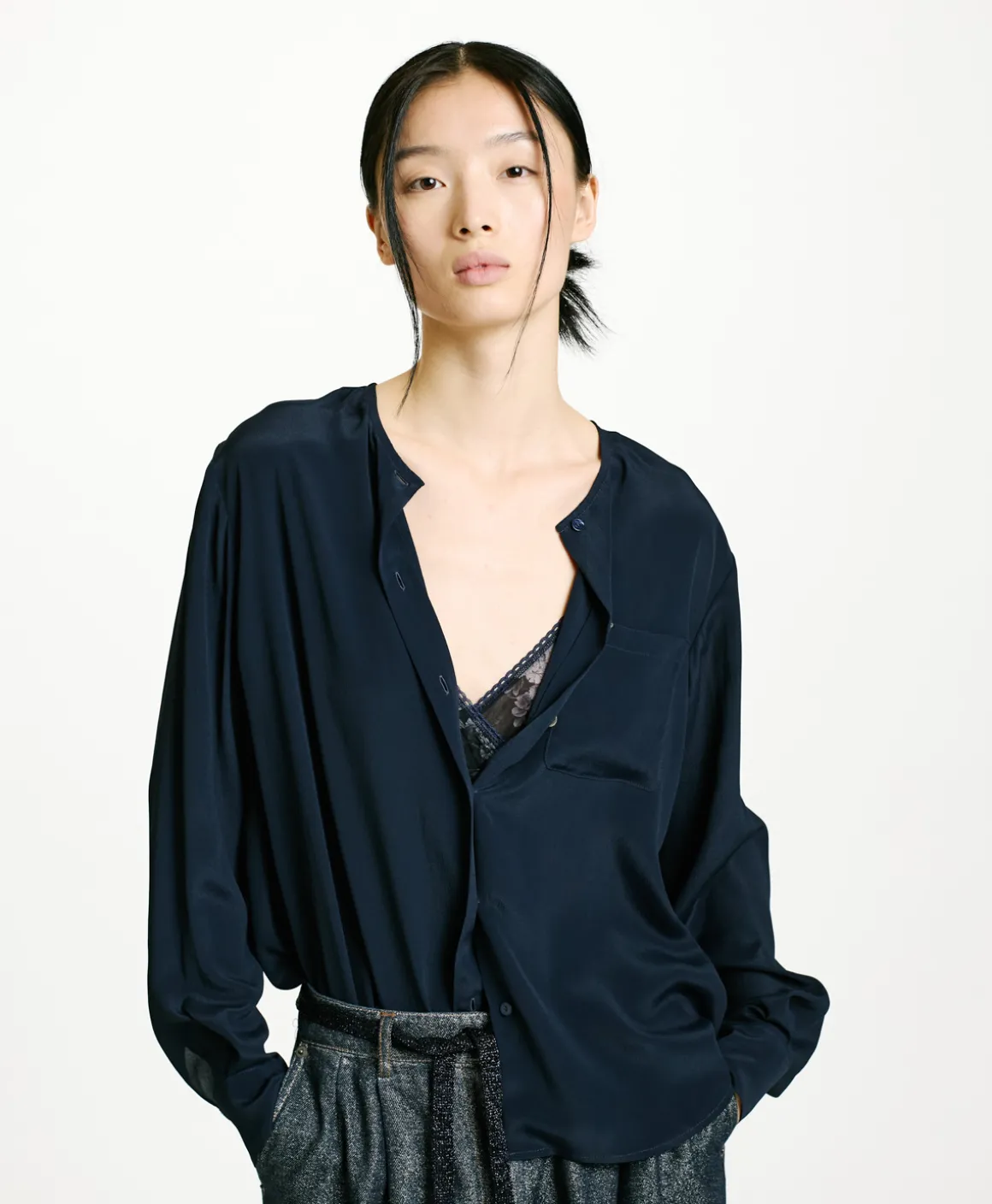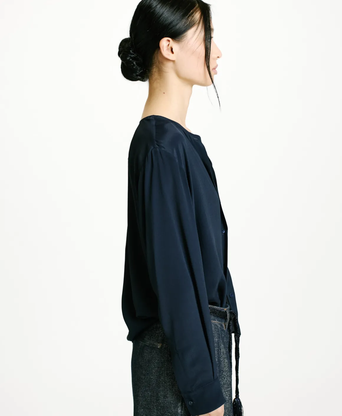 Raffinata blusa in crêpe misto seta, dal collo a giro piccolo, lista con piccoli bottoni a vista e taschino applicato. Maniche lunghe con polso.