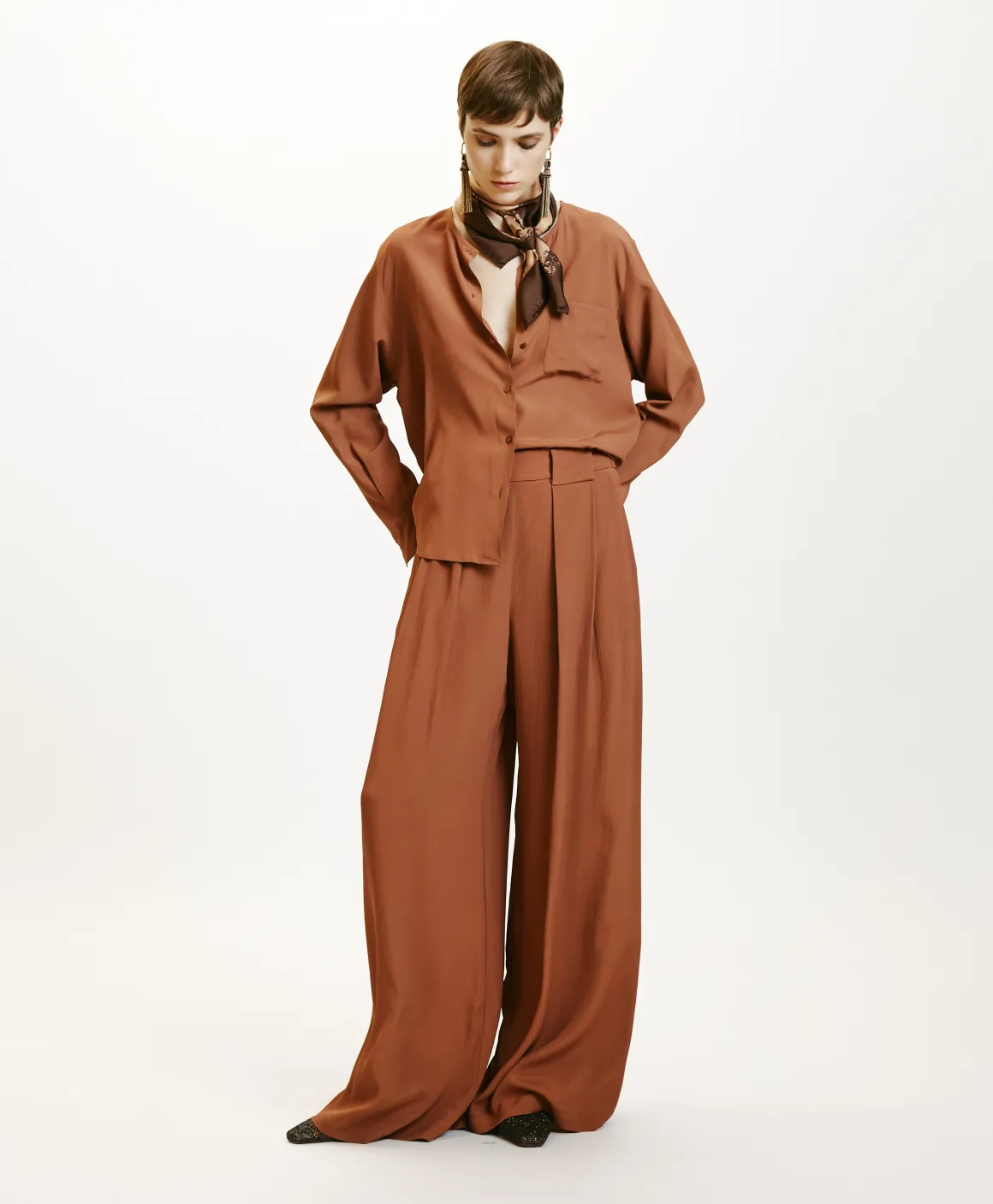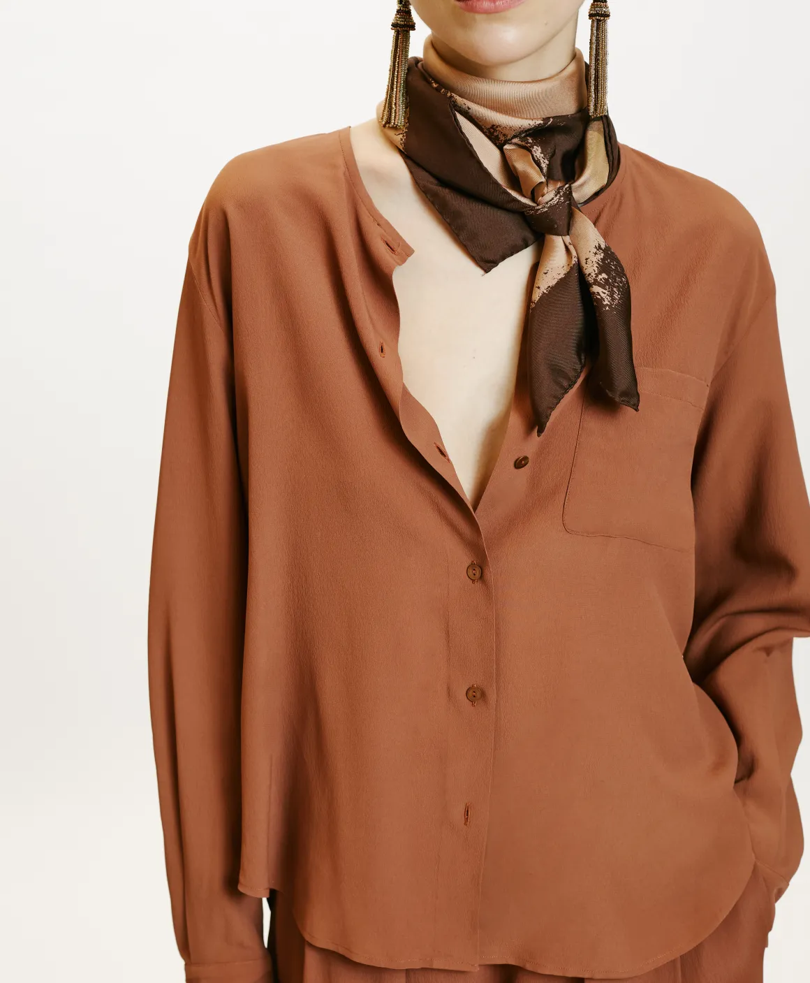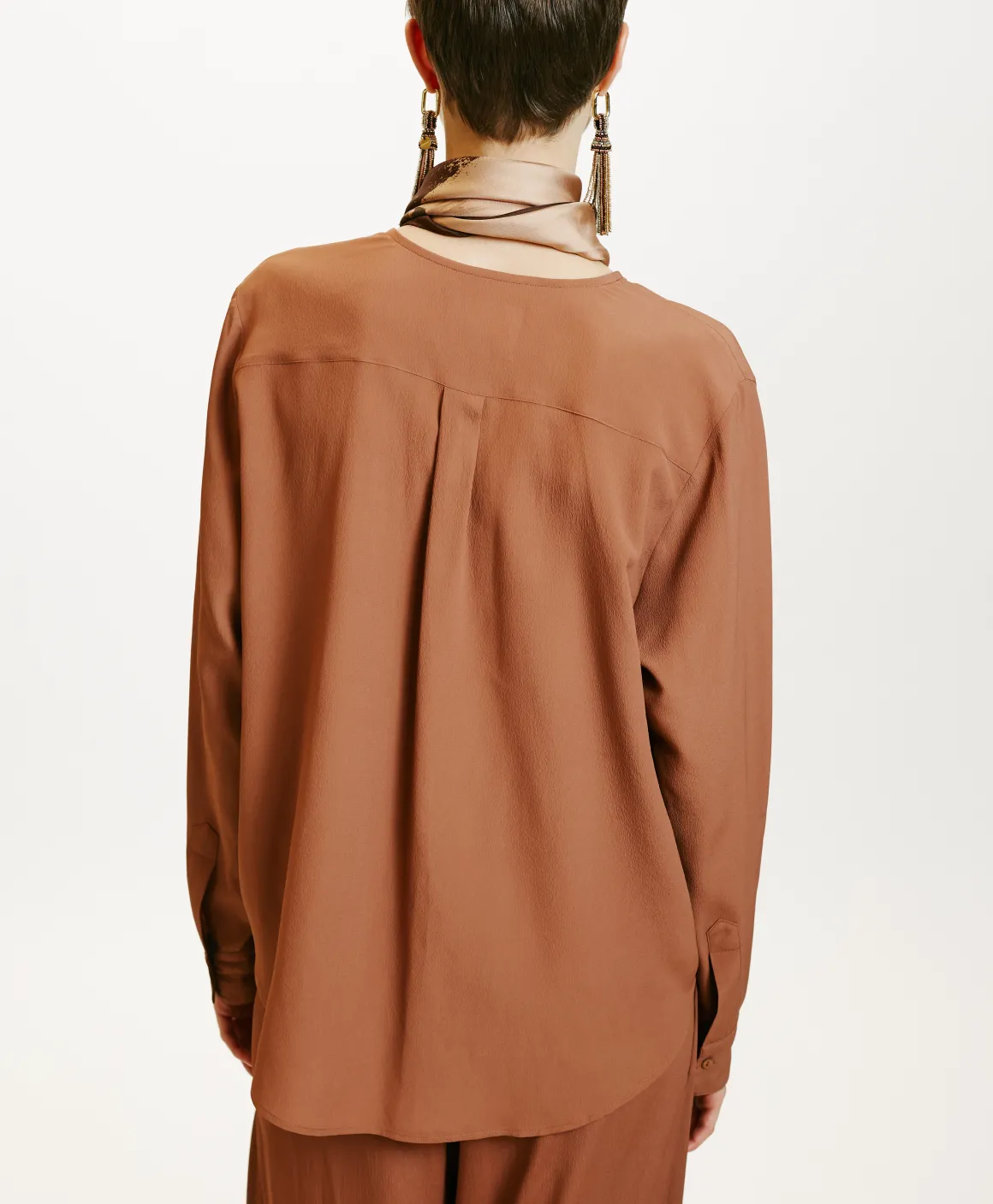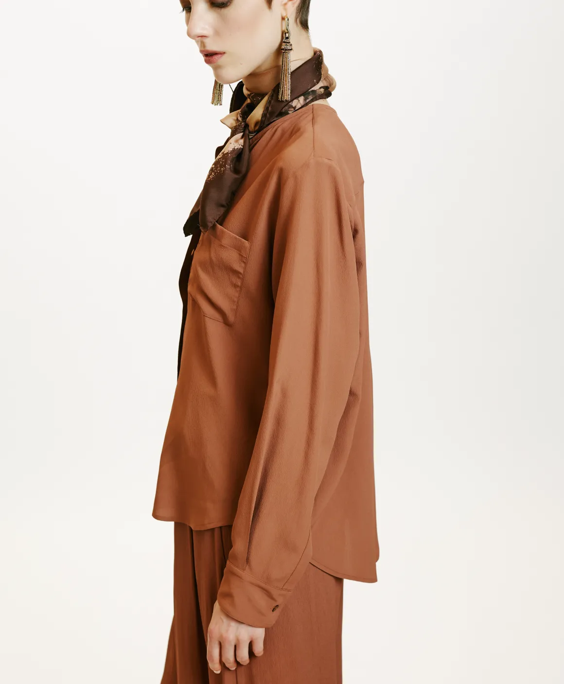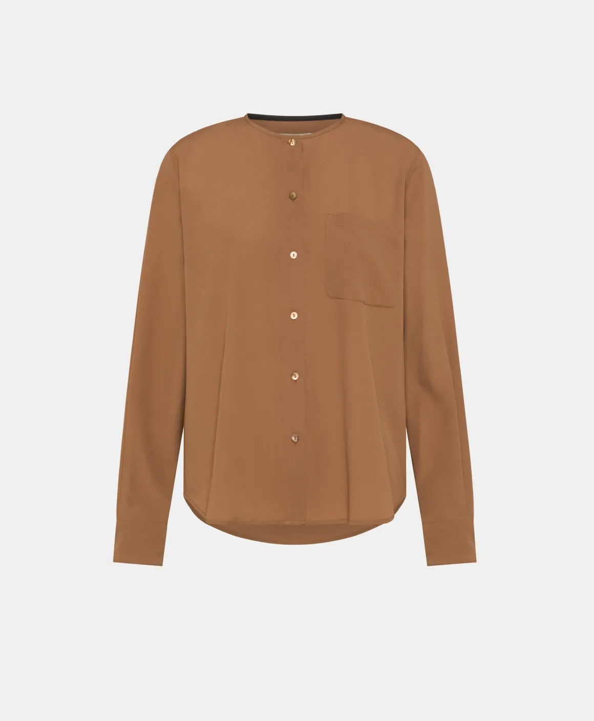 Raffinata blusa in crêpe misto seta, dal collo a giro piccolo, lista con piccoli bottoni a vista e taschino applicato. Maniche lunghe con polso.