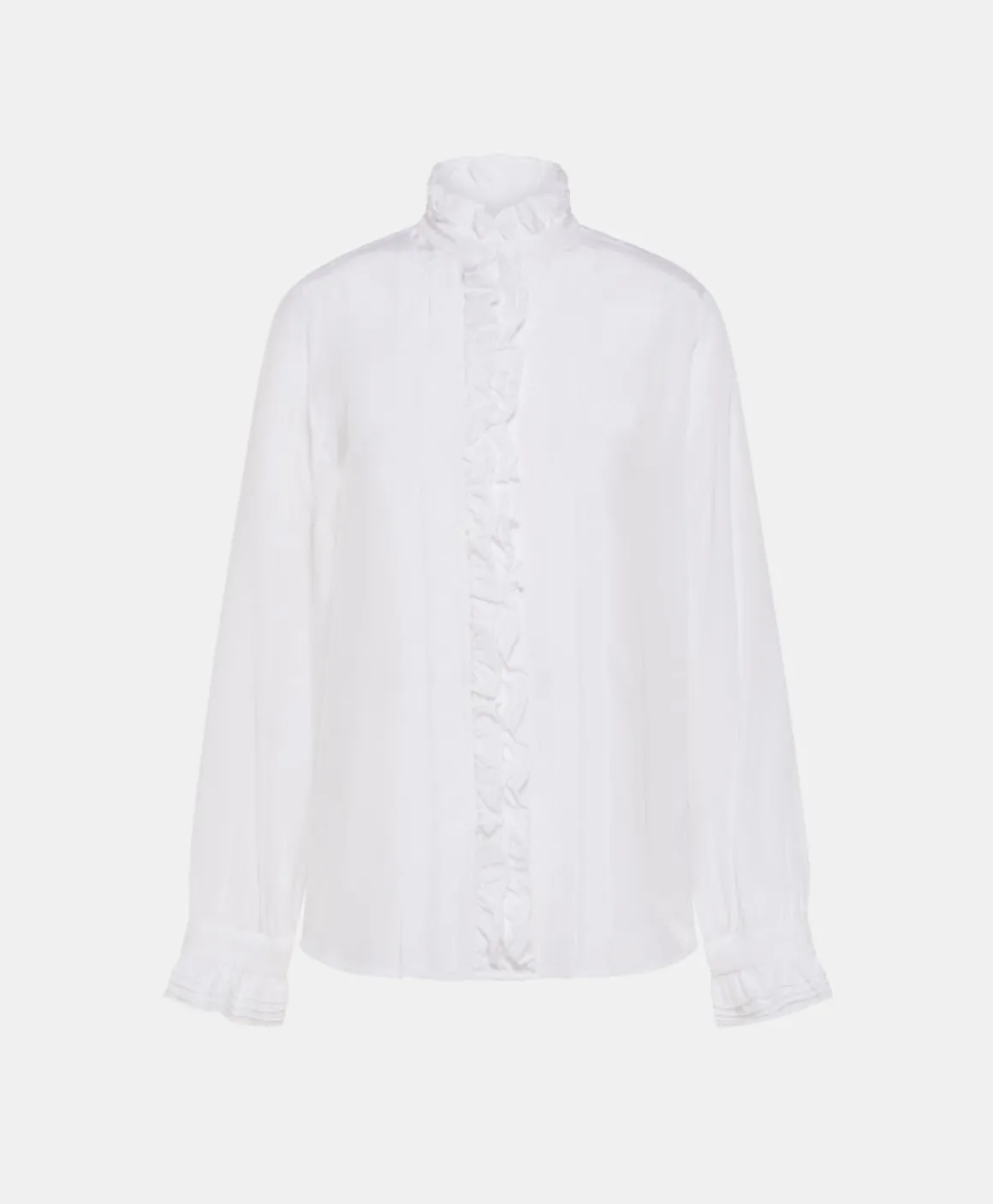 Raffinata camicia in viscosa fluida con piccole e ricche rouches che seguono la linea del collo e la lista dell’abbottonatura nascosta. Dettaglio di pieghe cucite sul davanti, maniche lunghe che chiudono su polsi a sbuffo con piegoline e chiusura con bottoncino a vista. Fondo stondato e più lungo sulla schiena.