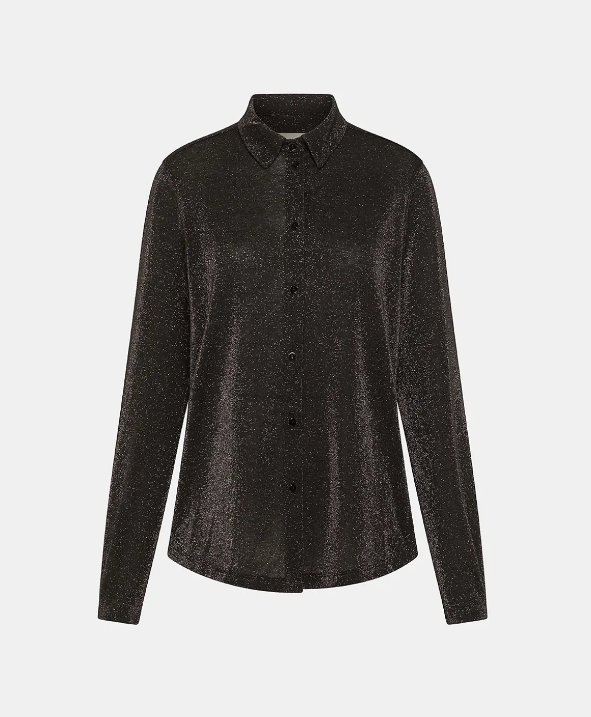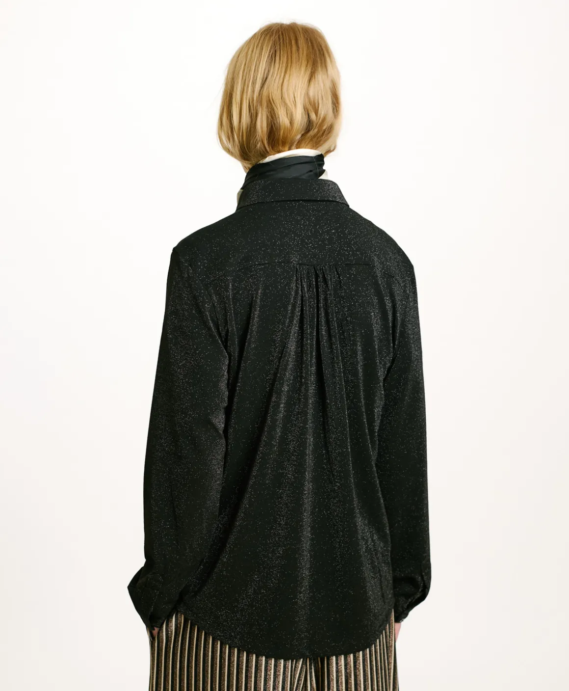 Camicia carry-over Momonì, presentata nella versione lurex. La Meudon ha una vestibilità confortevole sottolineata dal fondo leggermente stondato e dai delicati polsi a fascetta.