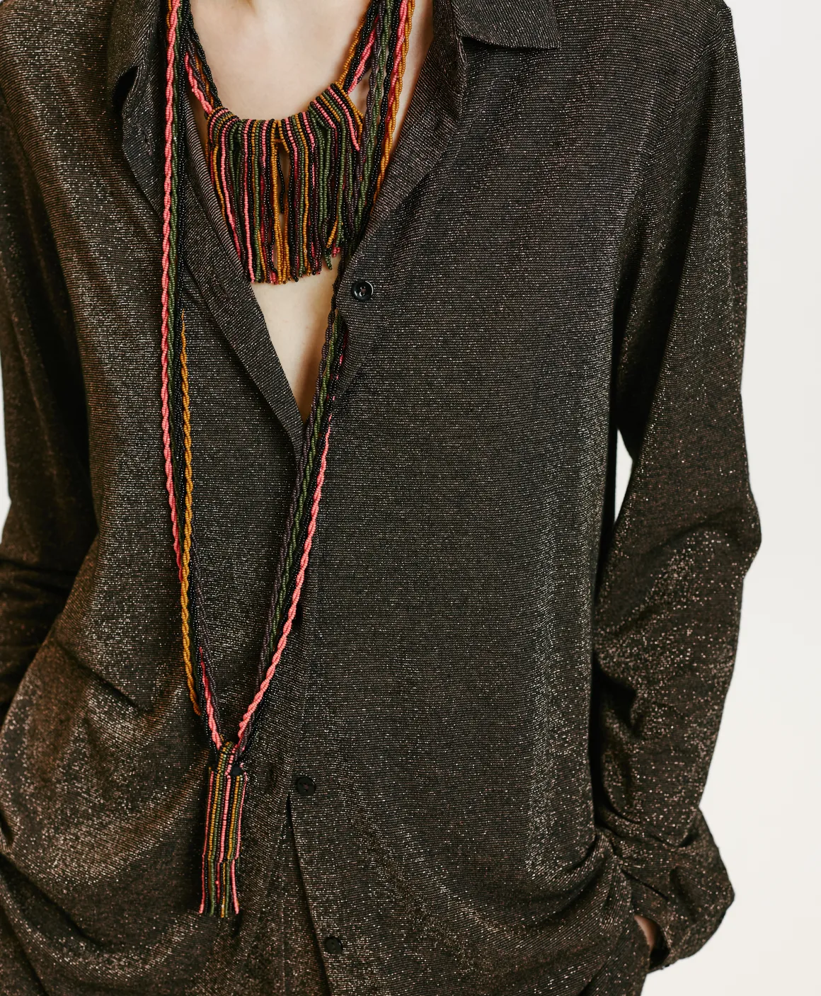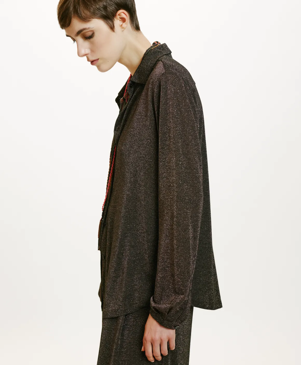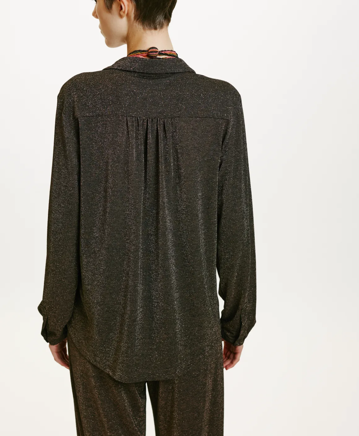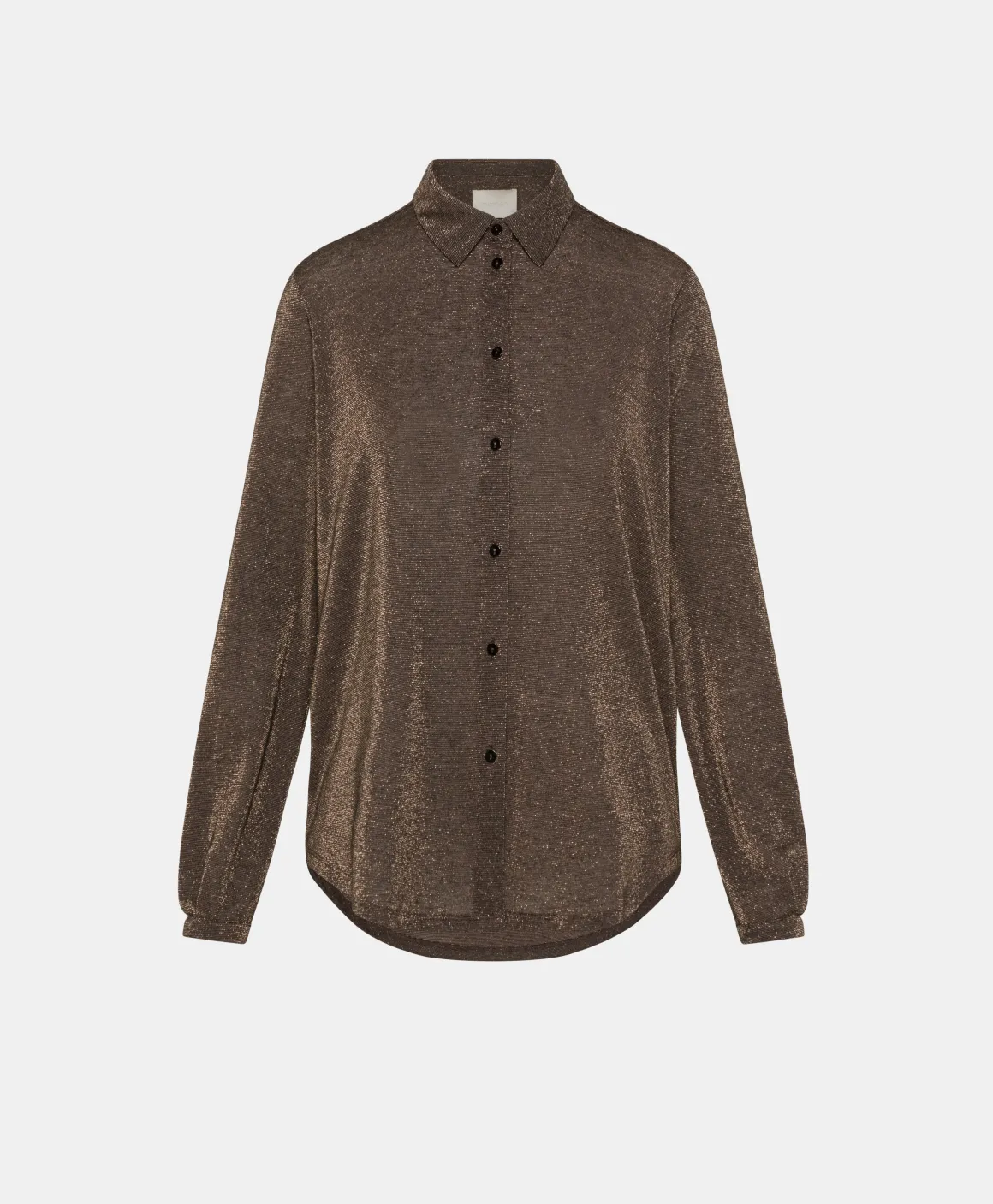 Camicia carry-over Momonì, presentata nella versione lurex. La Meudon ha una vestibilità confortevole sottolineata dal fondo leggermente stondato e dai delicati polsi a fascetta.
