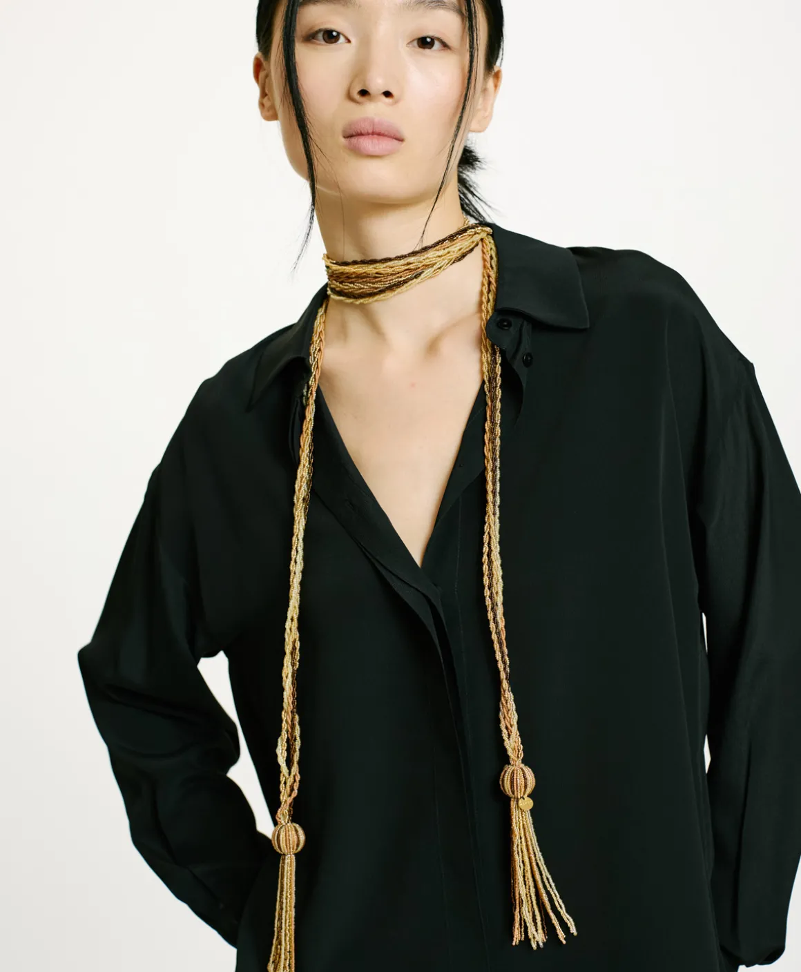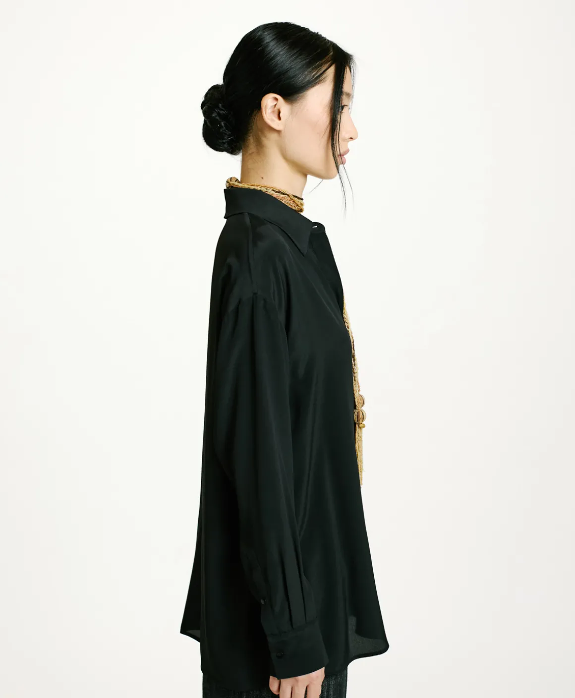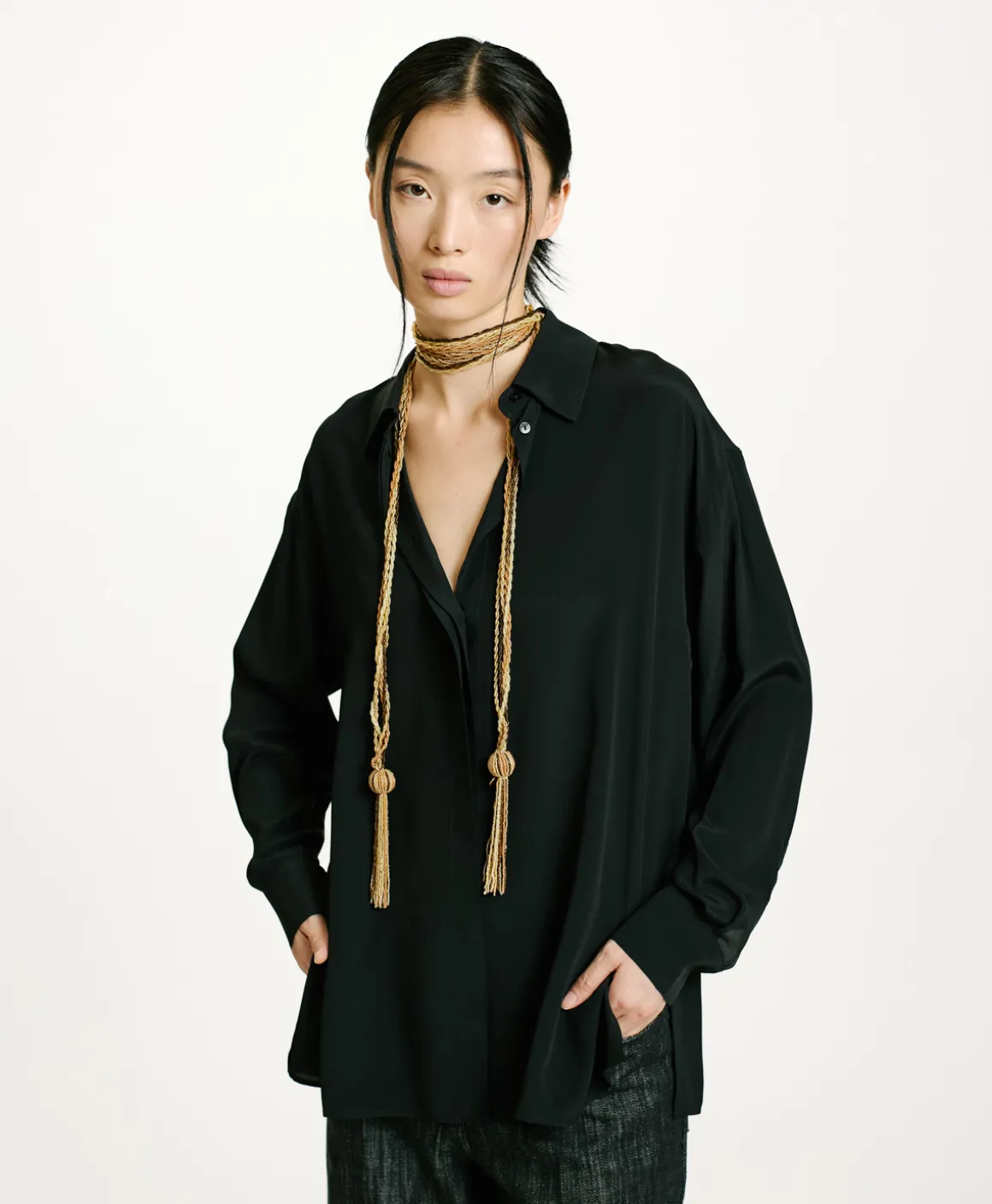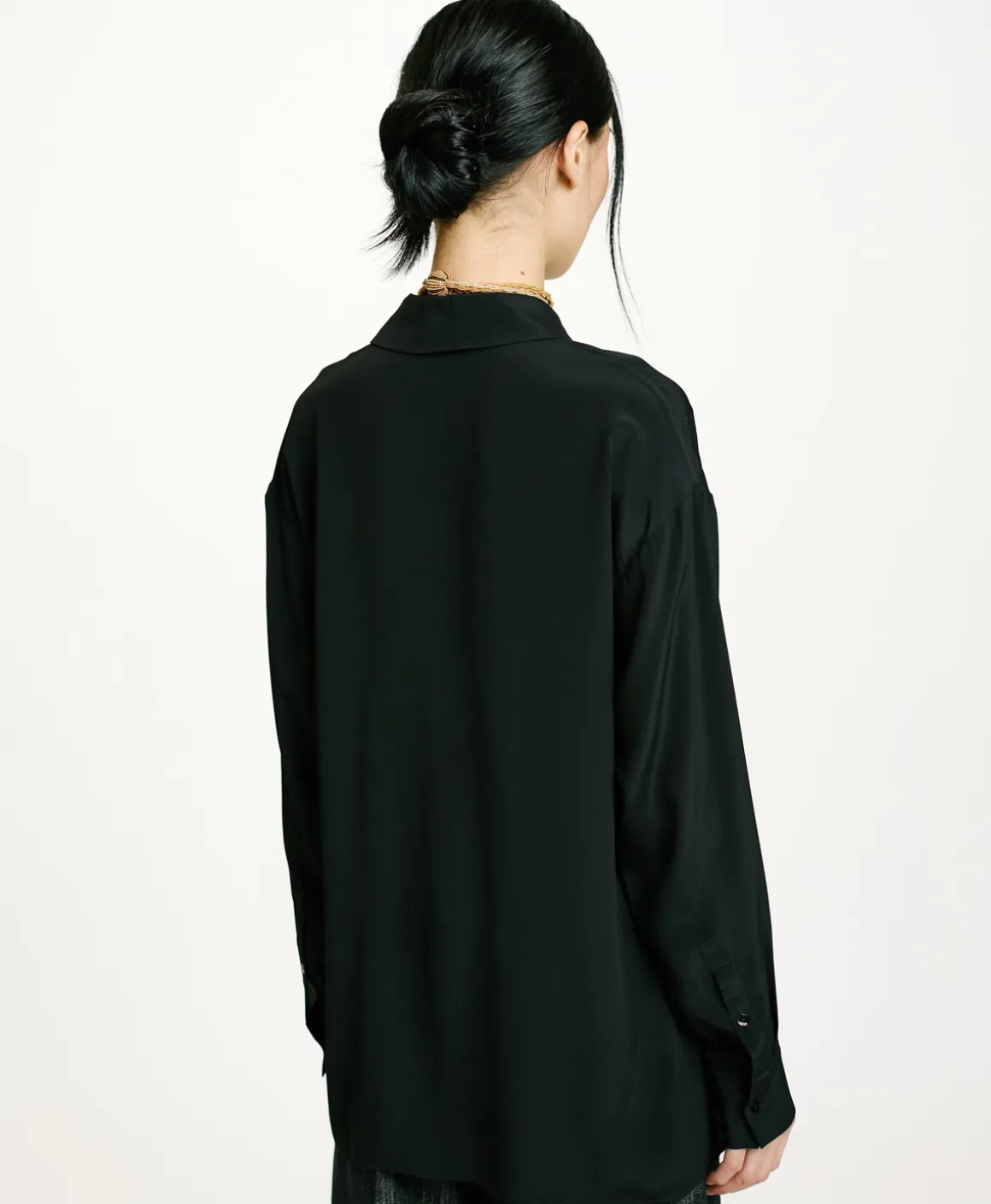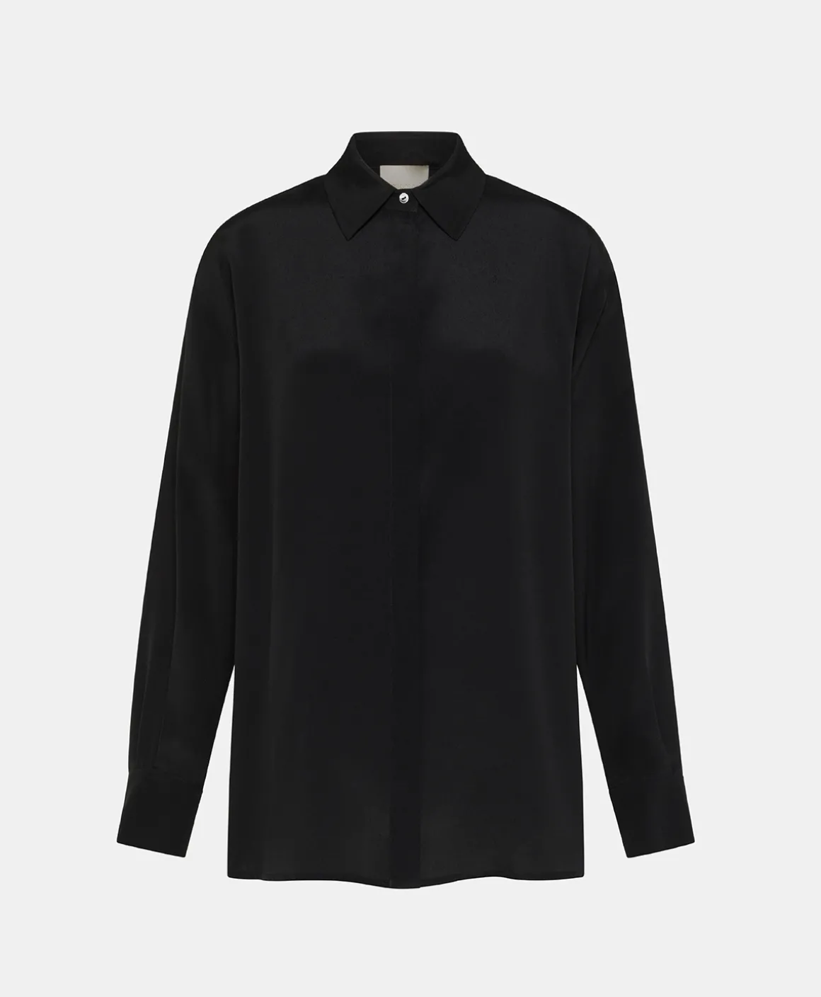 Camicia con collo a vela, manica lunga, in crêpe misto seta con abbottonatura nascosta. Fondo manica con polso e fessino a uomo chiuso con un bottone e piegoline. Vestibilità morbida con spacchi laterali.