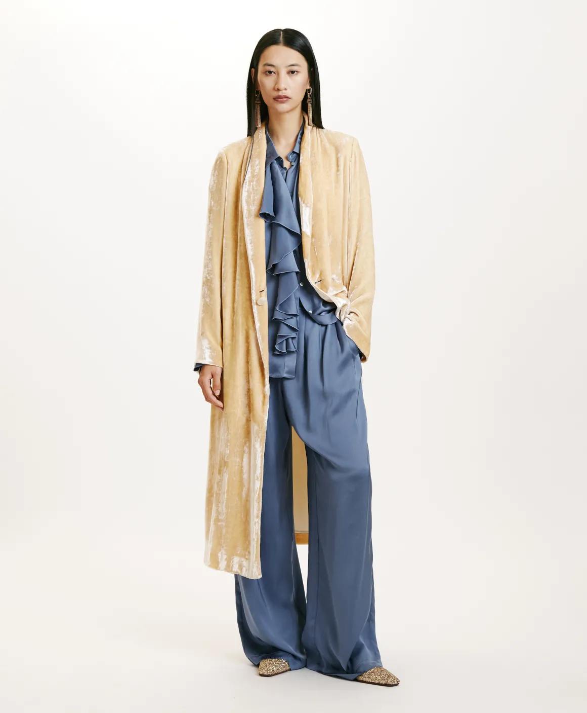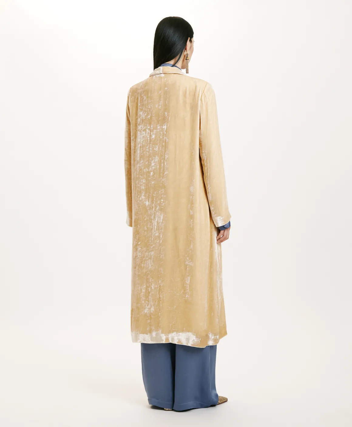 Elegante cappotto spolverino in velluto di seta viscosa a pelo lungo, con ampio collo a scialle, preziosa abbottonatura con gemello e tasche inserite nel fianco. Perfetto come soprabito per occasioni speciali. Costruzione foderata.
