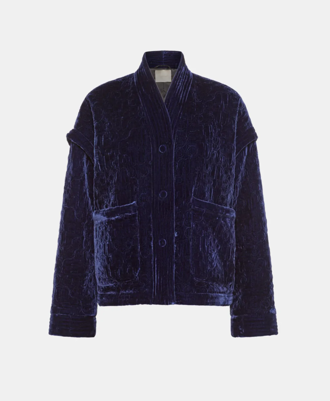 Giaccone bomber oversize in velluto prezioso di seta e viscosa interamente trapuntato e ricamato con motivo logo. “Kuma” presenta uno scollo a V, con lista lavorata con cuciture multiple, dettaglio ripreso anche nell’aletta del giromanica e sui polsi. Chiusura con bottoni automatici e costruzione foderata.