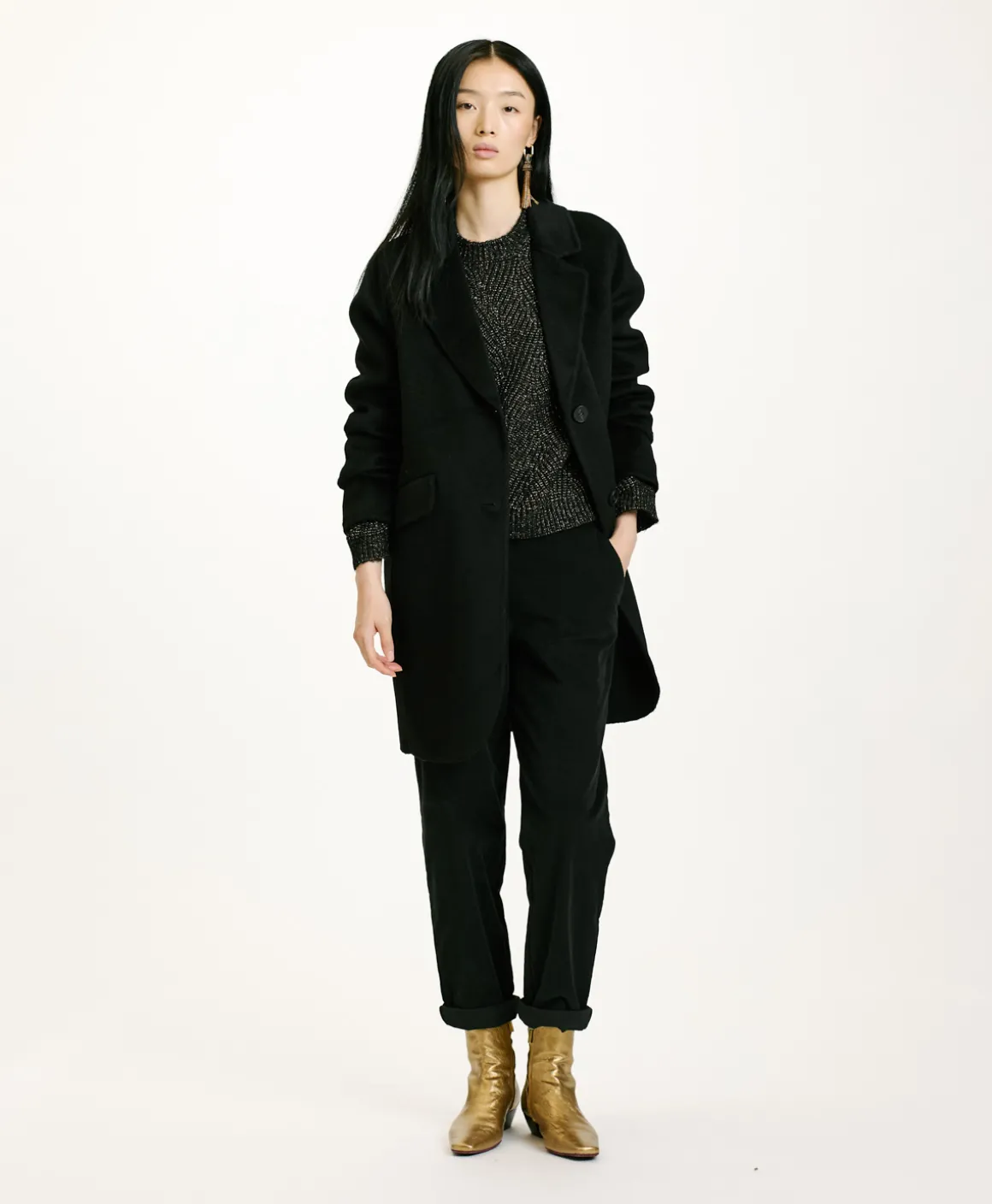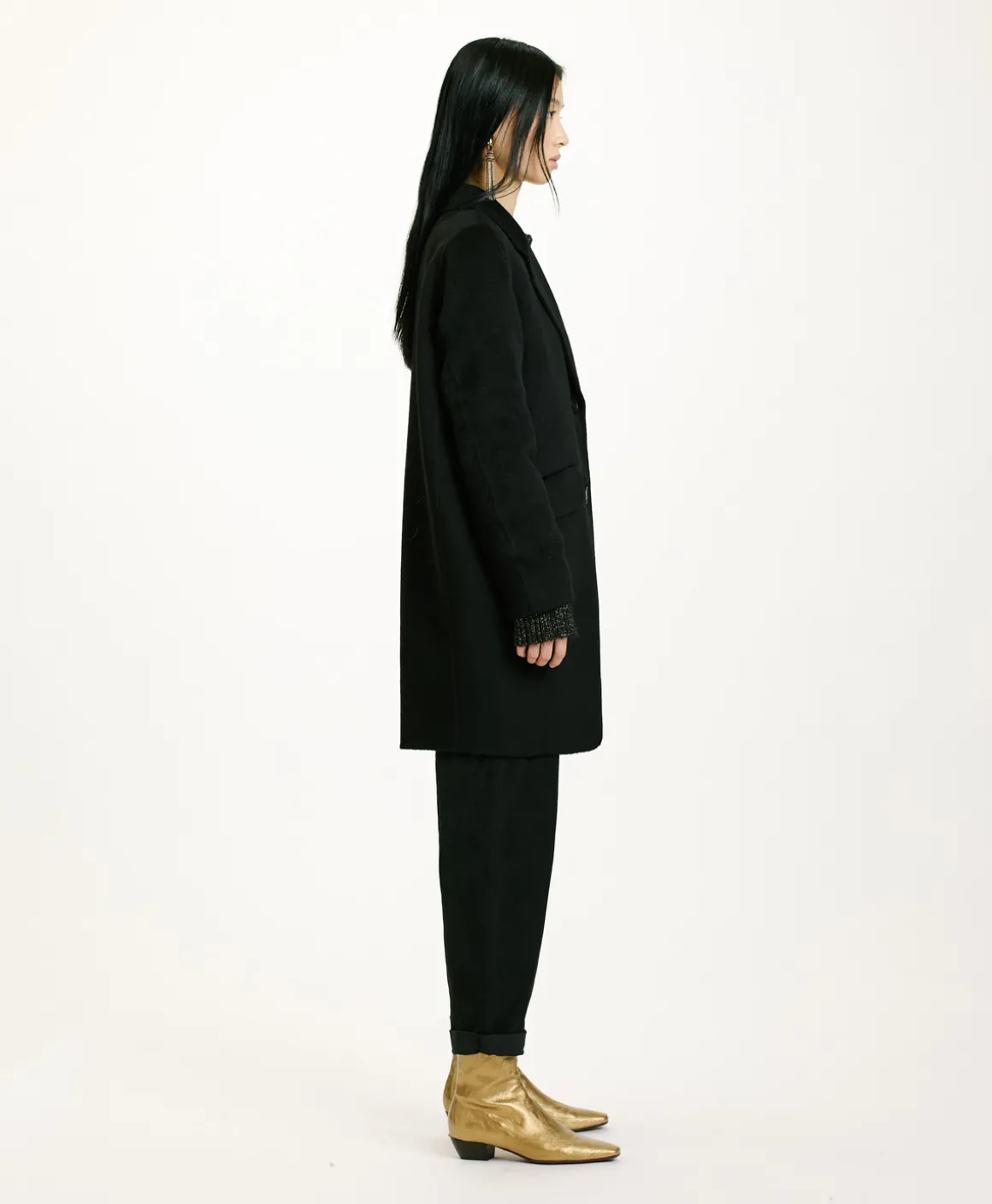 Cappotto corto dalla linea a uovo in panno di lana con pregiata lavorazione double. Chiusura con due bottoni, collo a revêres e tasche a pattina inclinata. Costruzione sfoderata.