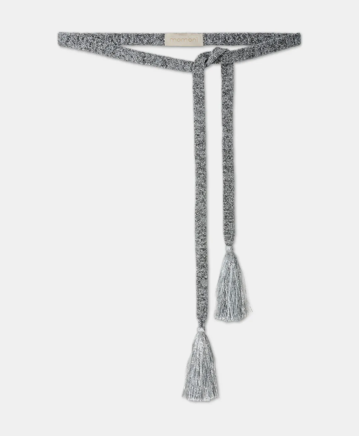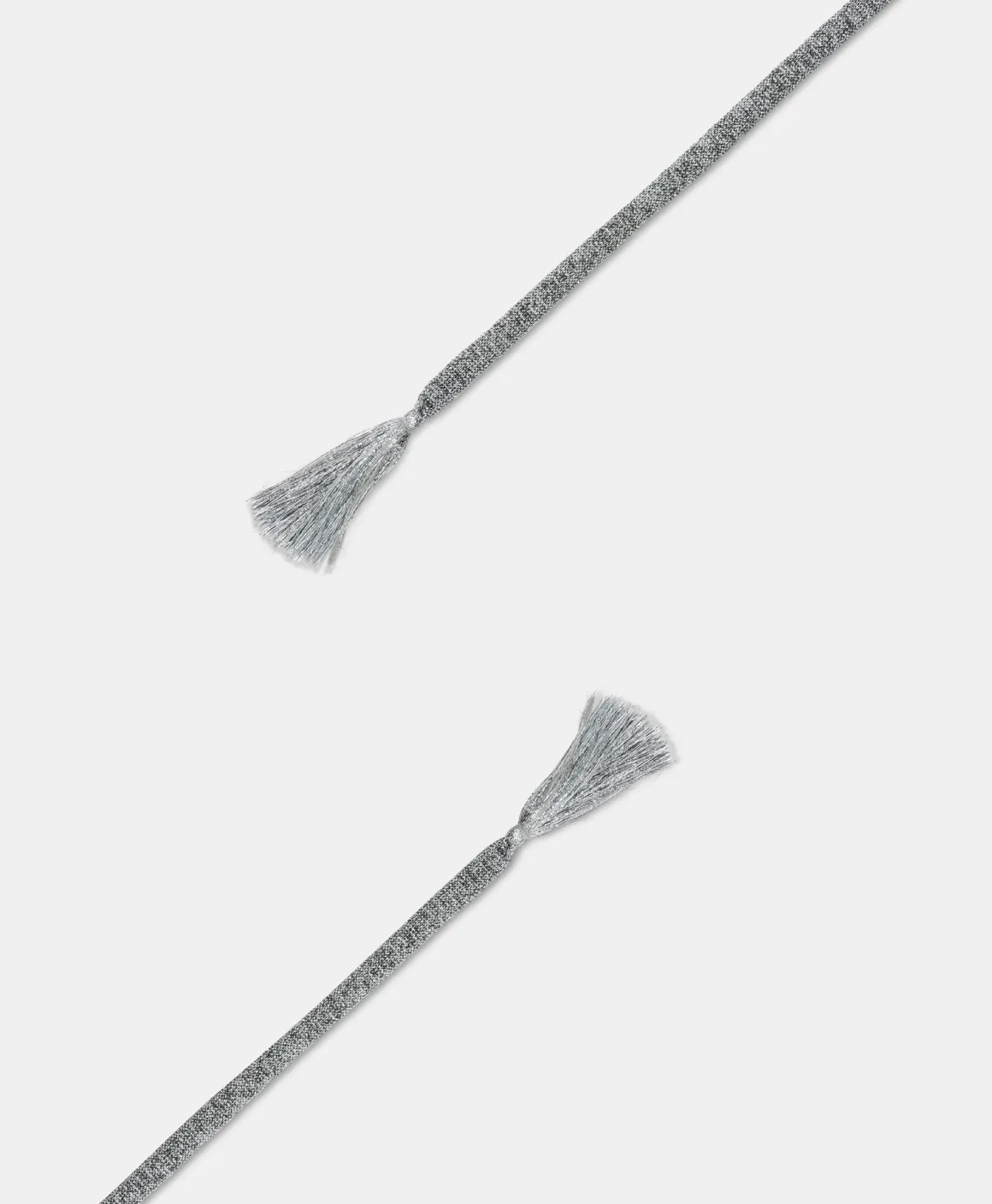 Cintura laccetto carry-over in filato tubolare di acetato lurex con dettaglio maxi nappe sulle estremità. Made in Italy.