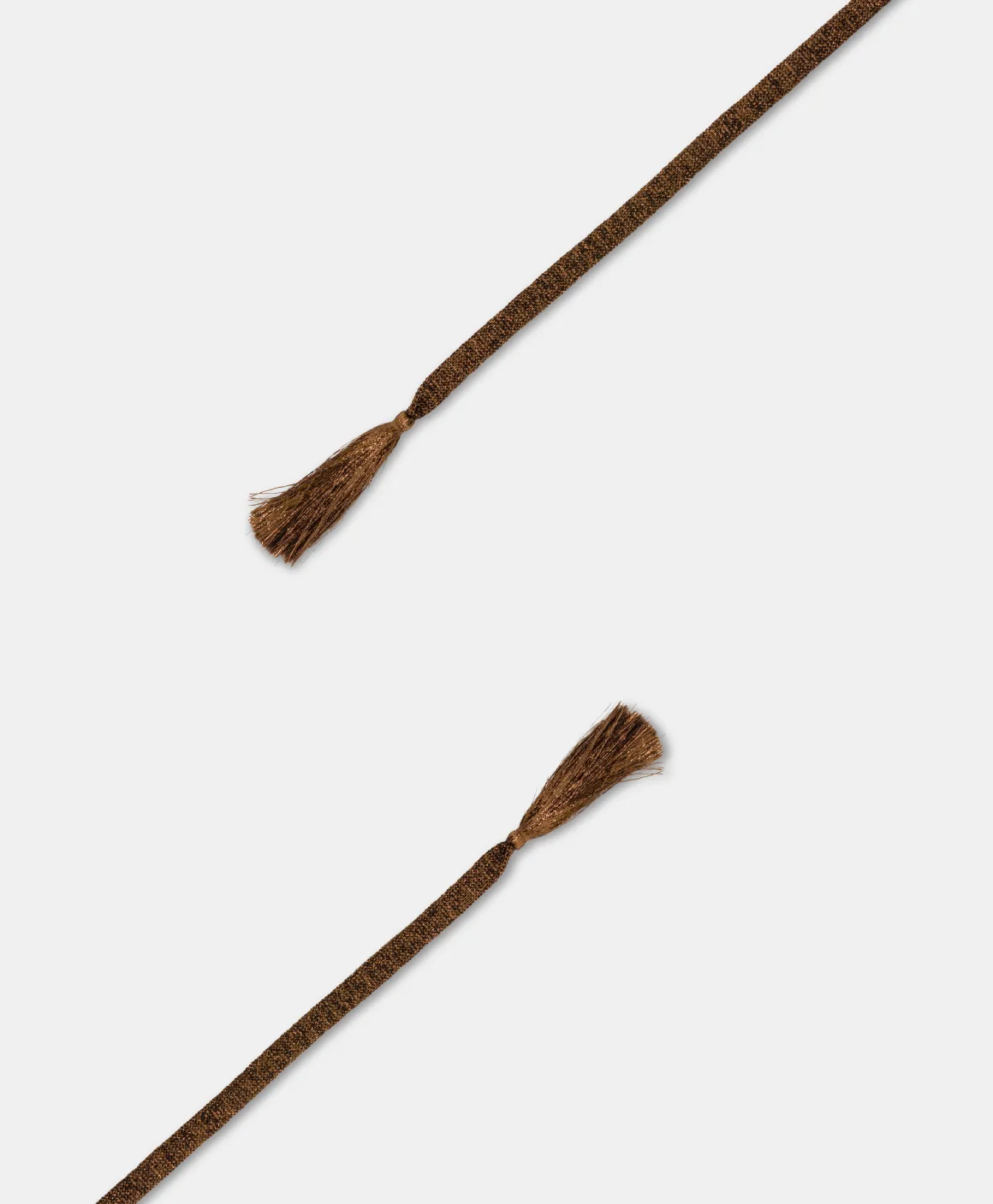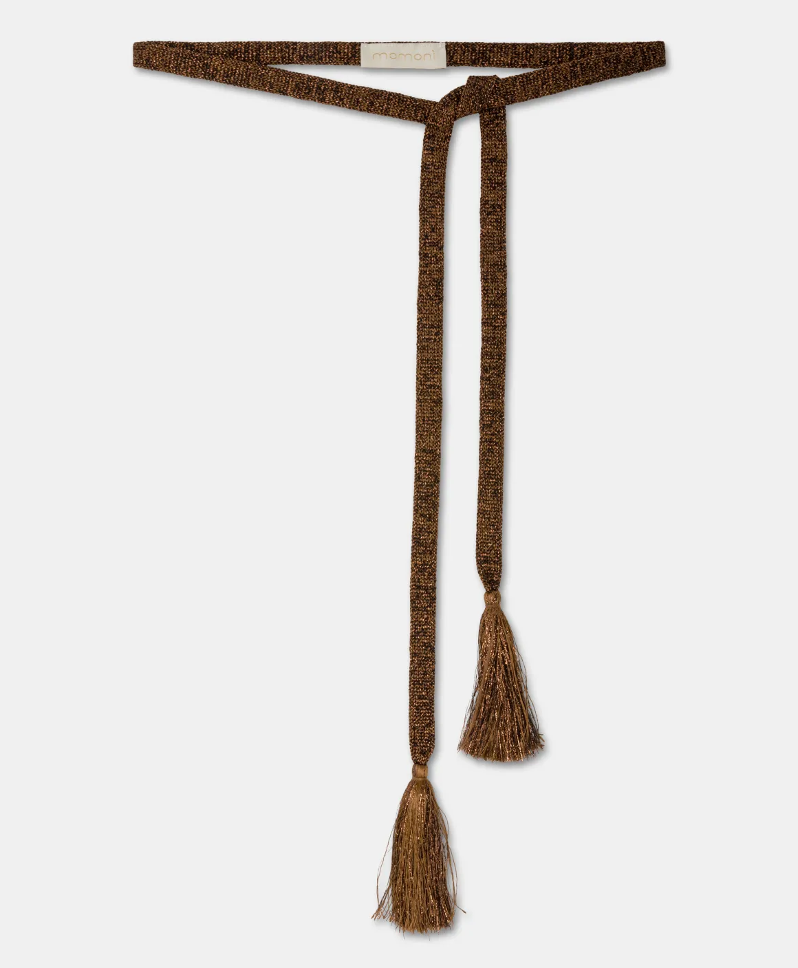 Cintura laccetto carry-over in filato tubolare di acetato lurex con dettaglio maxi nappe sulle estremità. Made in Italy.