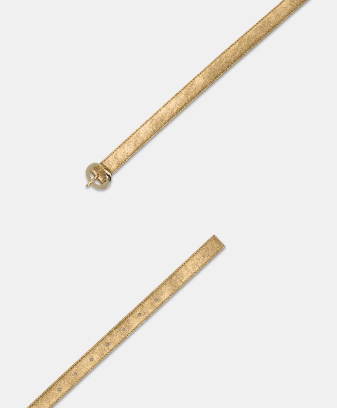 Cintura in ecopelle laminata, con fibbia tonda, galvanica oro chiaro.
