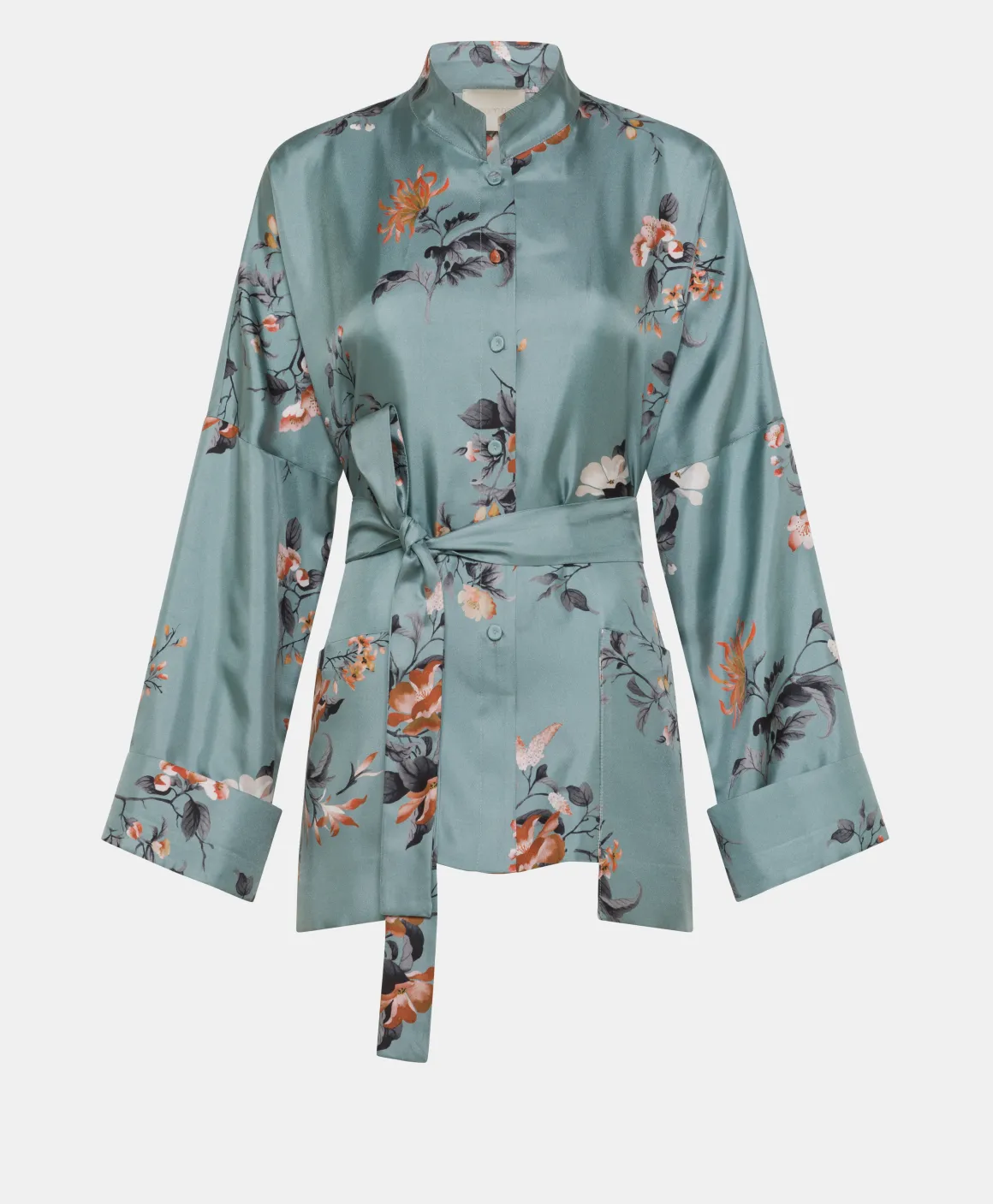 Giacca sfoderata in twill di pura seta stampato, con cintura in vita ed originale dettaglio delle tasche a toppa applicate sul davanti. Il collo alla coreana e il volume morbido rendono questa giacca dal sapore orientale un capo raffinato e contemporaneo.
