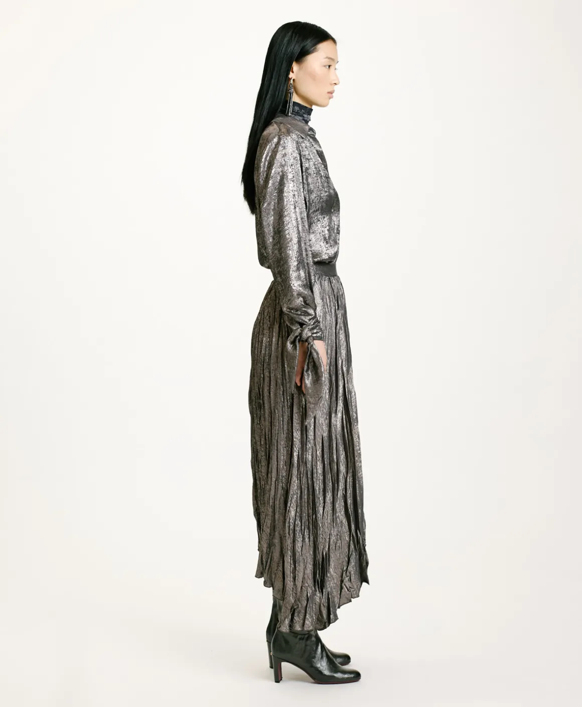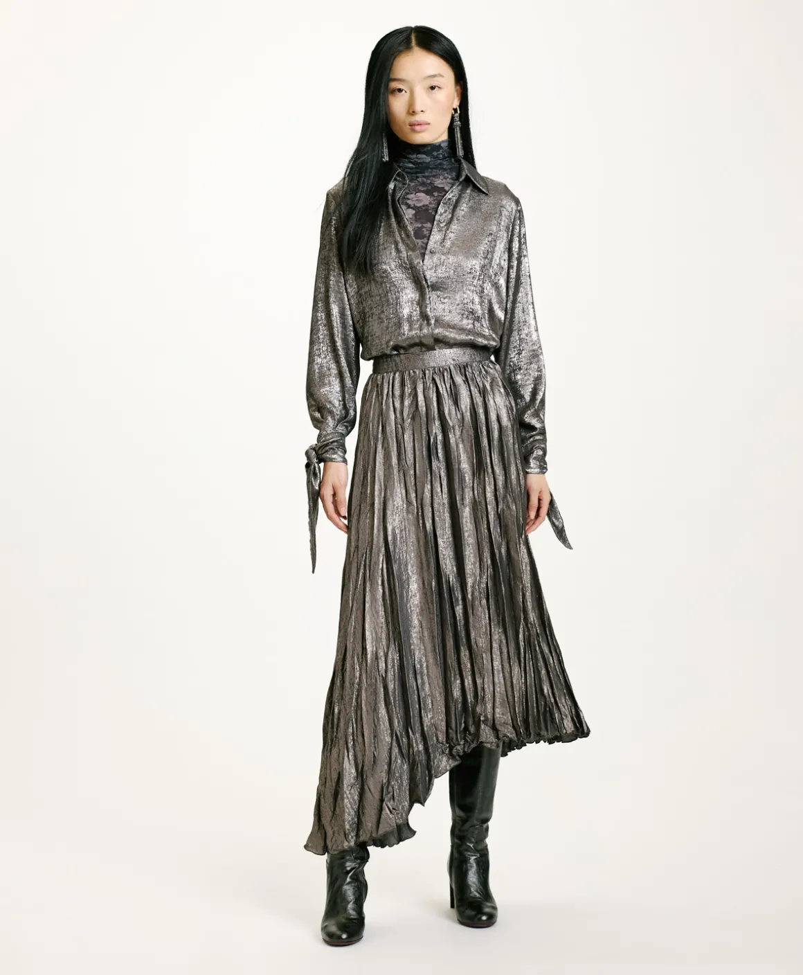 Gonna midi in tessuto fluido laminato con lavorazione plissé effetto stropicciato. Fondo con orlo asimmetrico, cinturino basso, zip laterale.