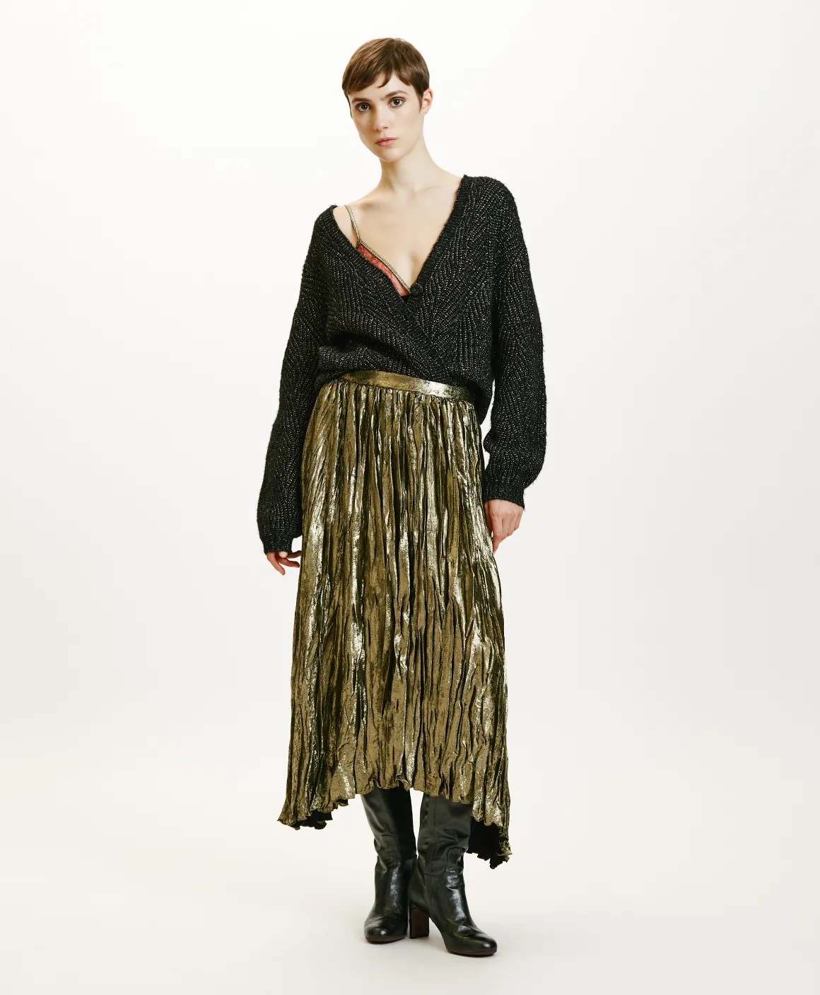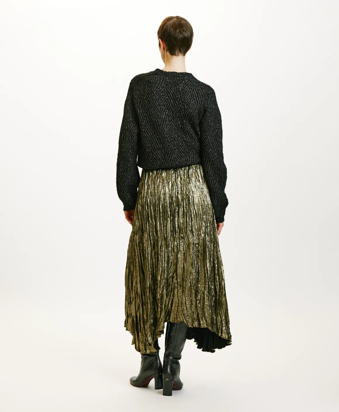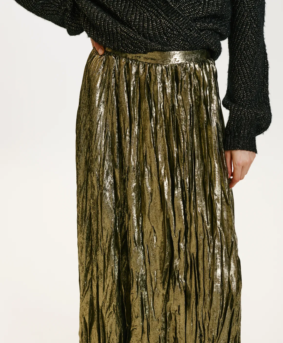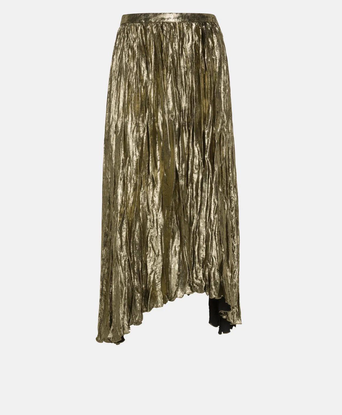 Gonna midi in tessuto fluido laminato con lavorazione plissé effetto stropicciato. Fondo con orlo asimmetrico, cinturino basso, zip laterale.