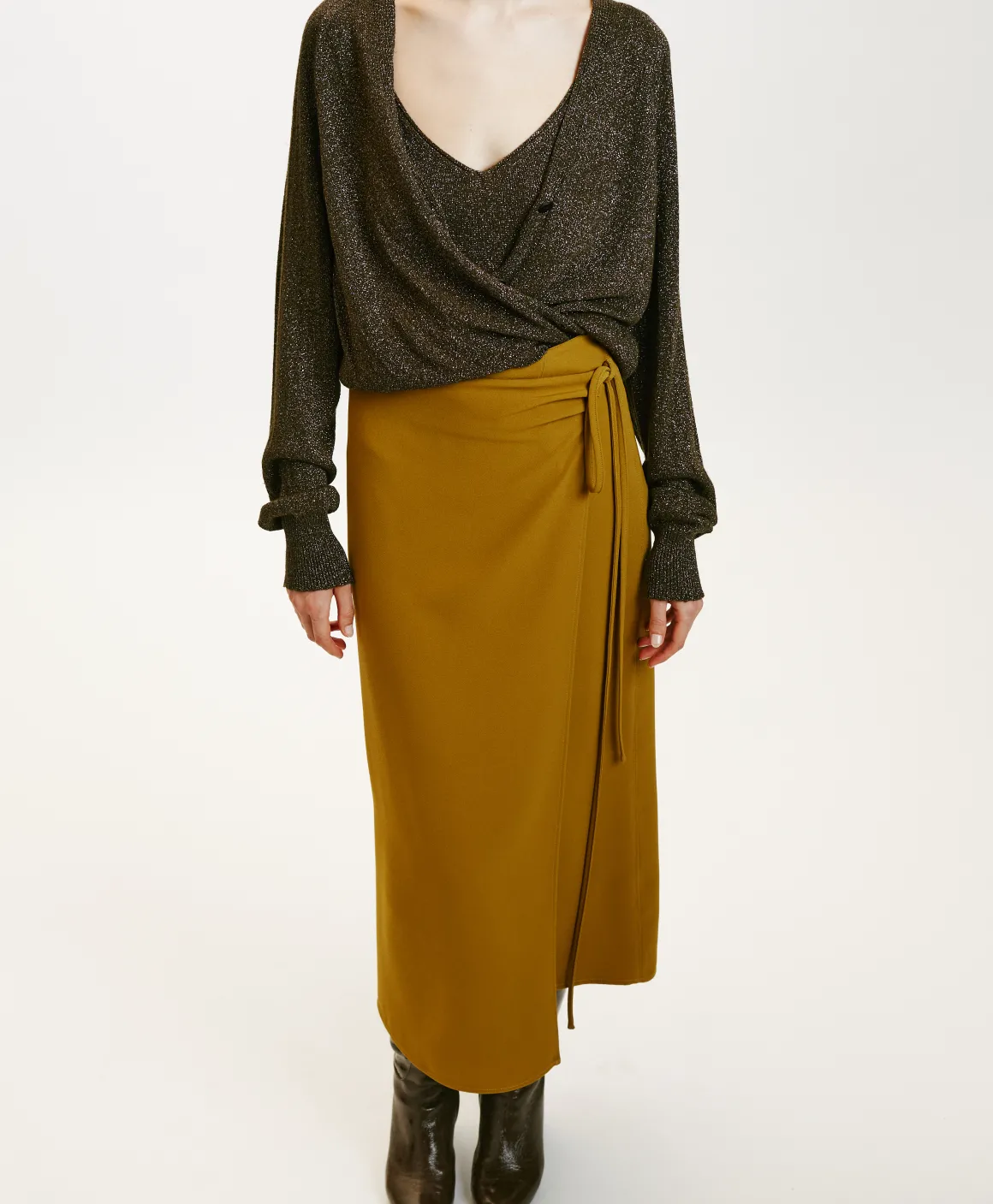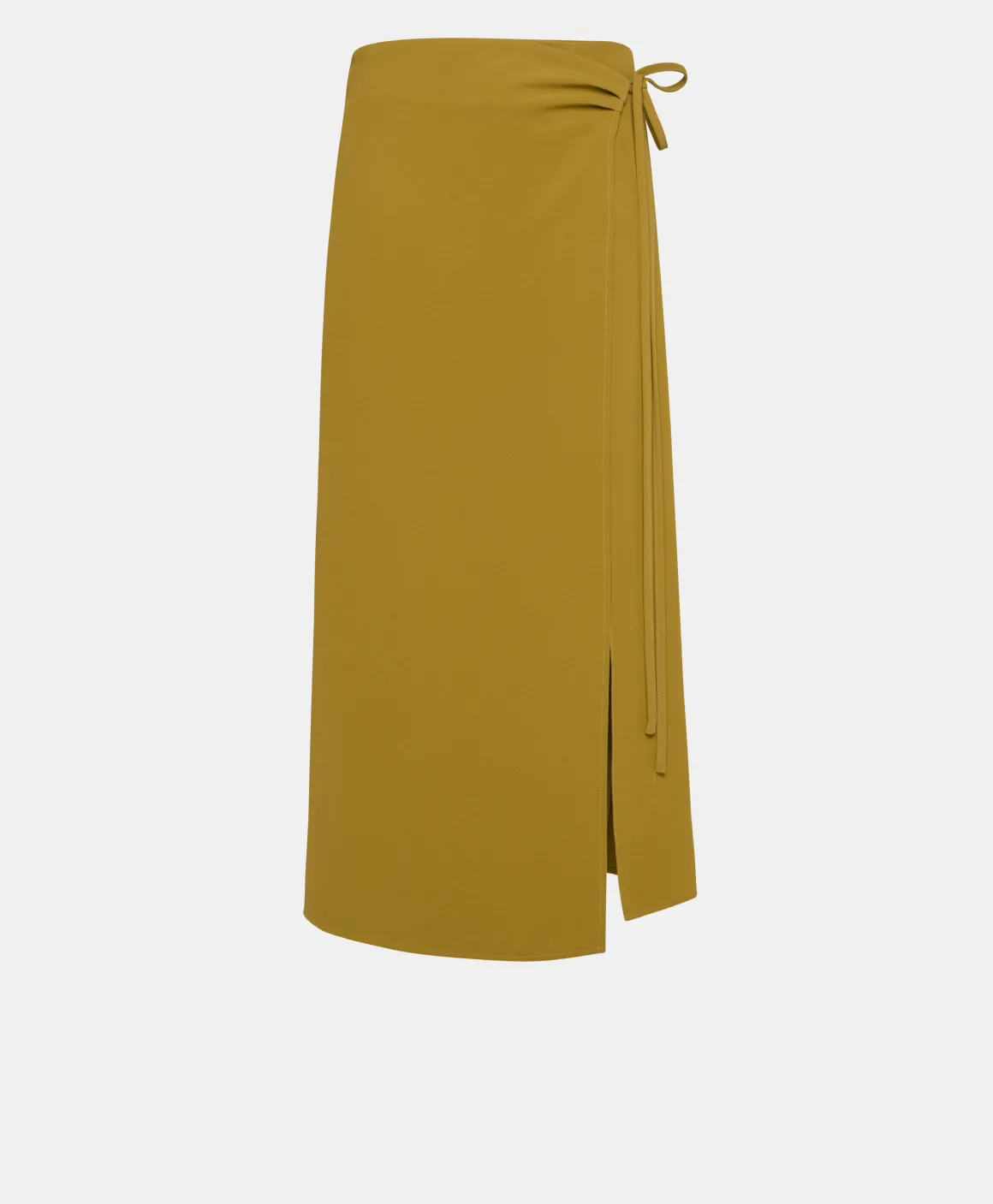 Gonna lunghezza midi in tessuto Cady stretch. Costruzione ” a portafoglio” con drappeggio di piegoline sul fianco e laccetti. Spacco centrale e chiusura interna con bottone. Vestibilità aderente con pinces sul dietro.