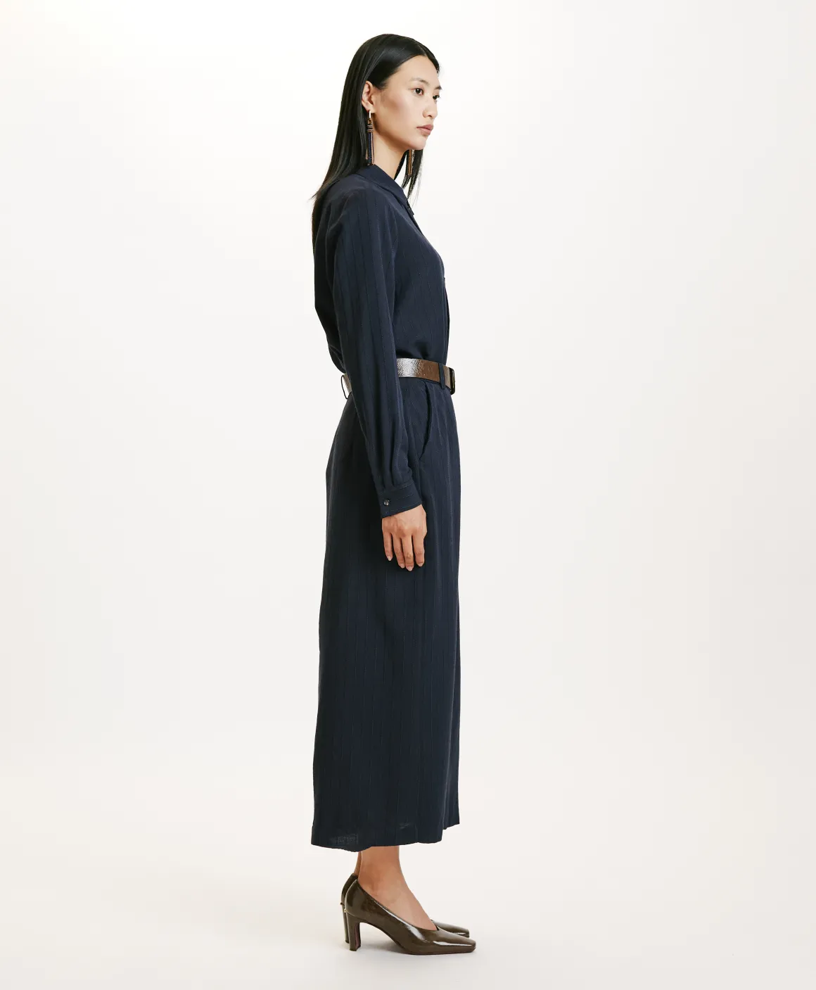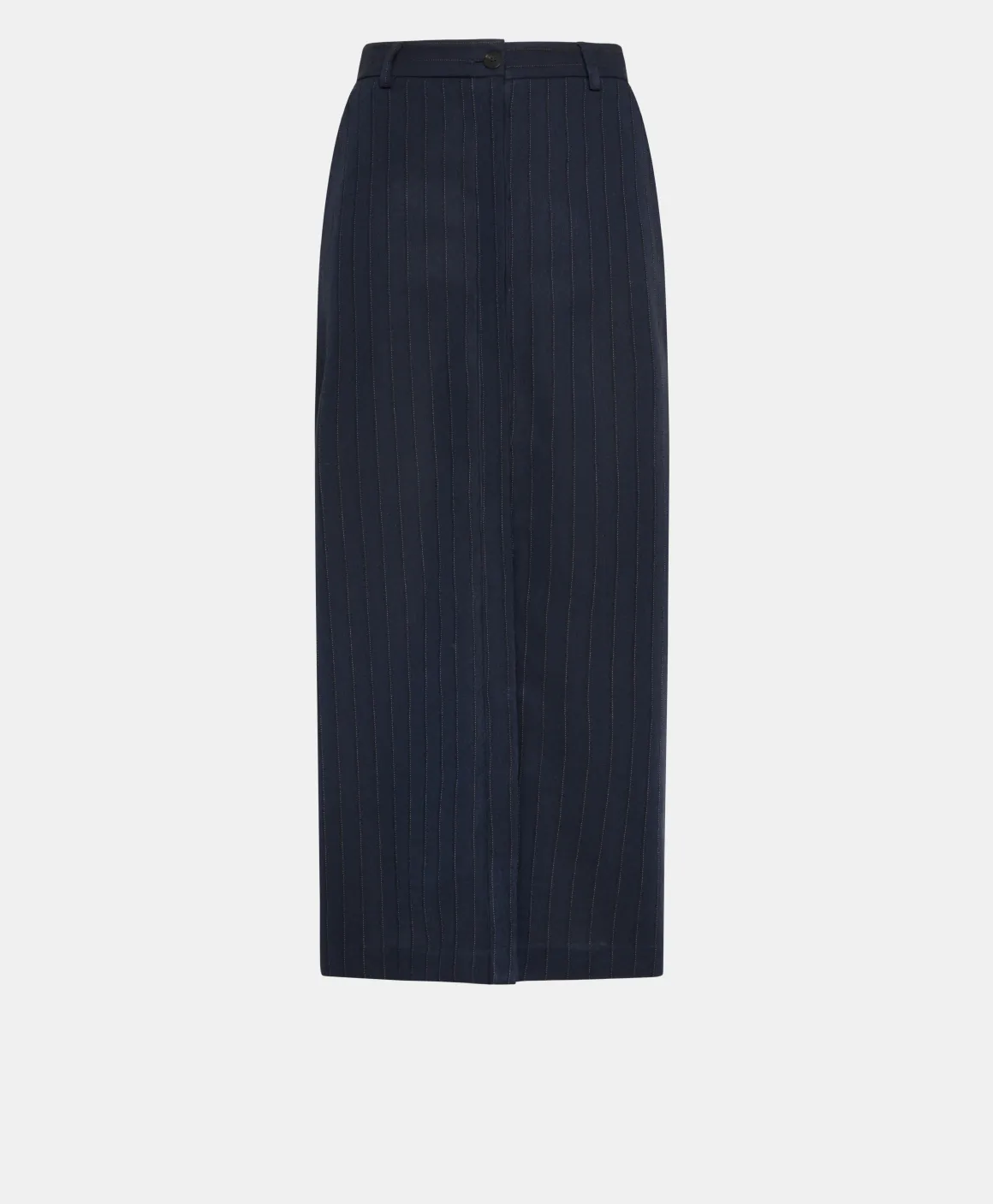 Gonna longuette in twill di lana e viscosa con disegnatura gessata. Linea dritta e lunga con abbottonatura nascosta sul centro davanti, cinturino costruito con passanti e tasche alla francese.