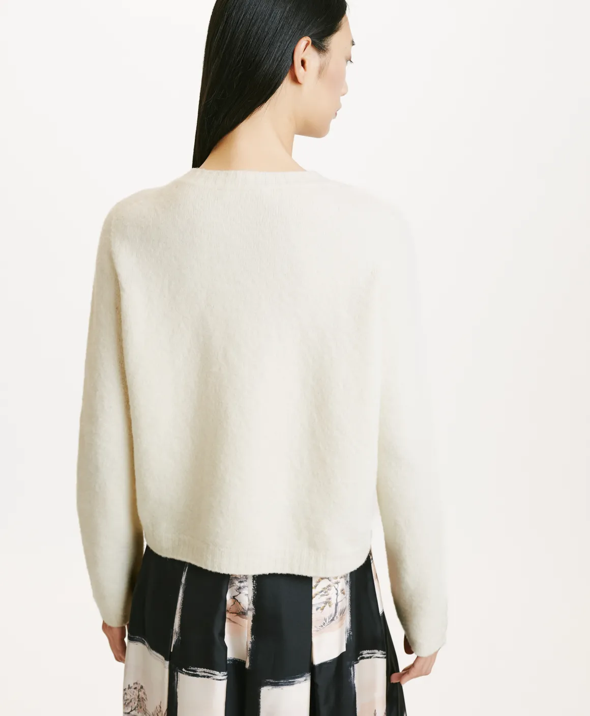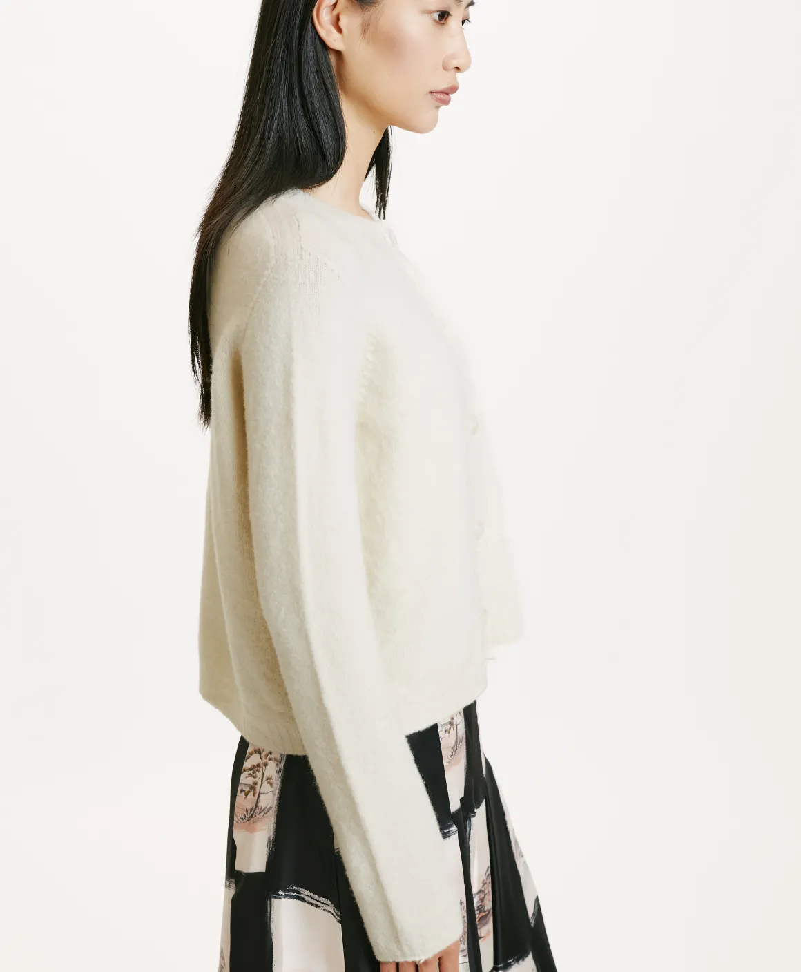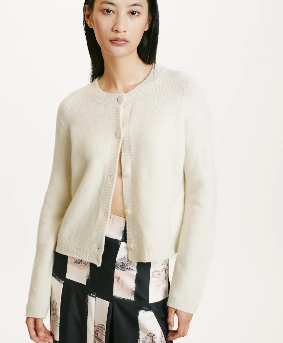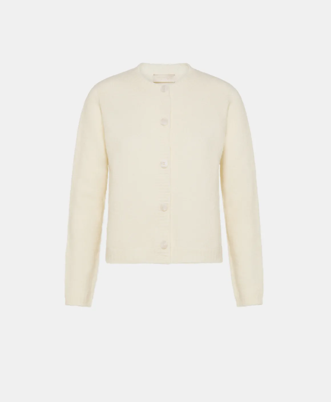 piccolo cardigan da volume slim realizzato in filato di lana elasticizzata effetto felpa. Made in italy
