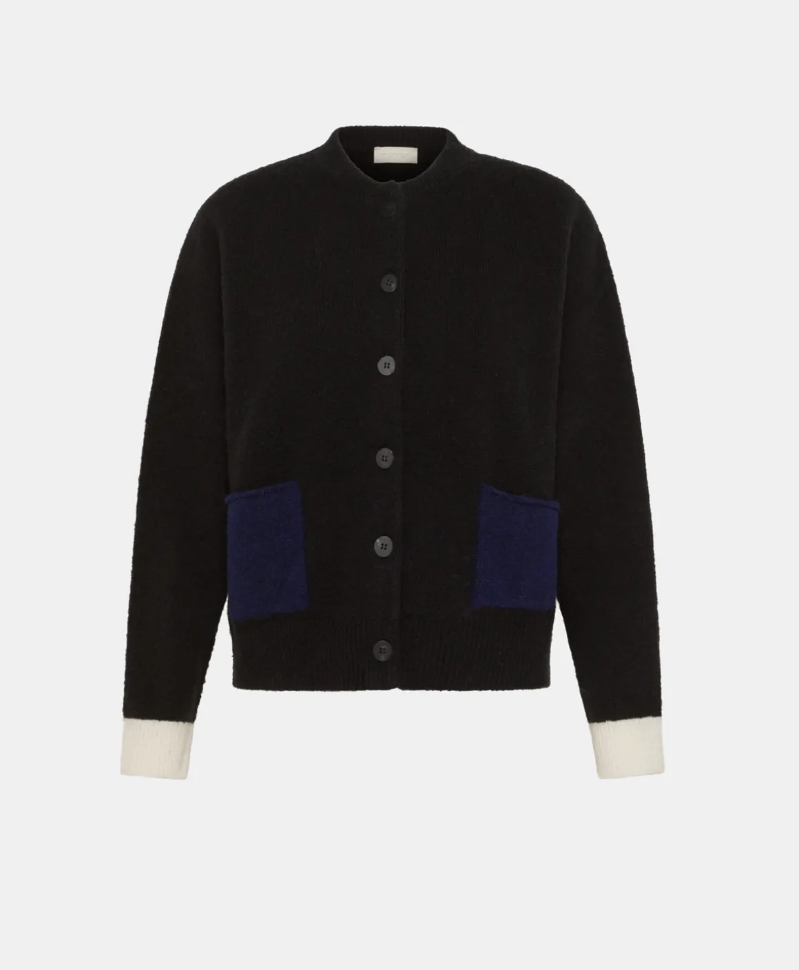 Cardigan in filato di lana elasticizzata effetto felpa. Particolare gioco di colori a contrasto, a formare dei blocchi sul collo, sui fondi e sui fianchi. Rifiniture a coste alte. Made in Italy
