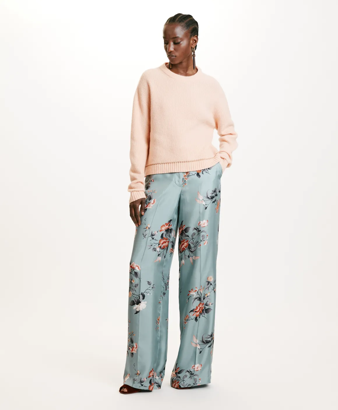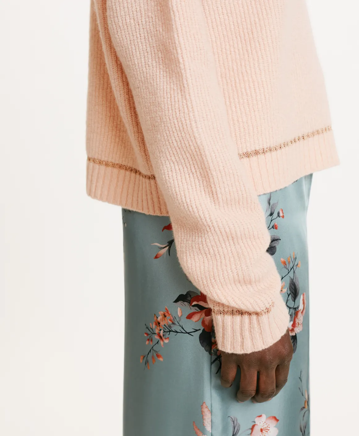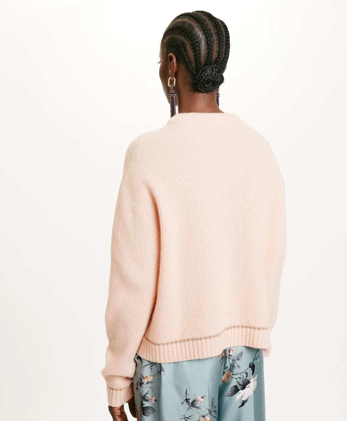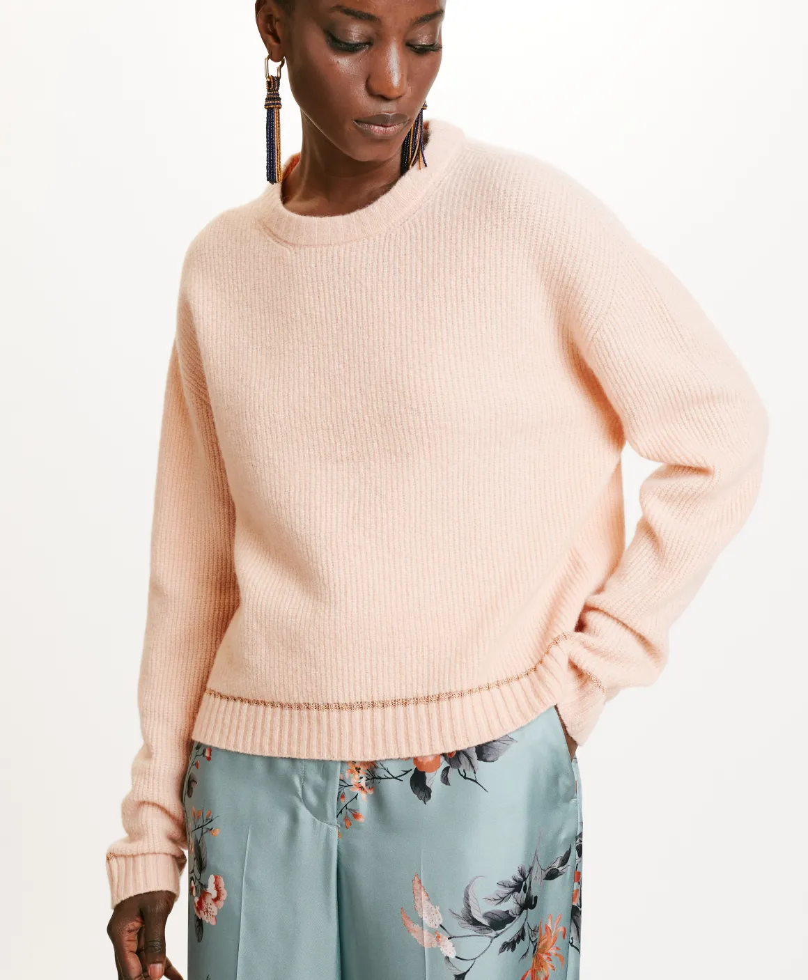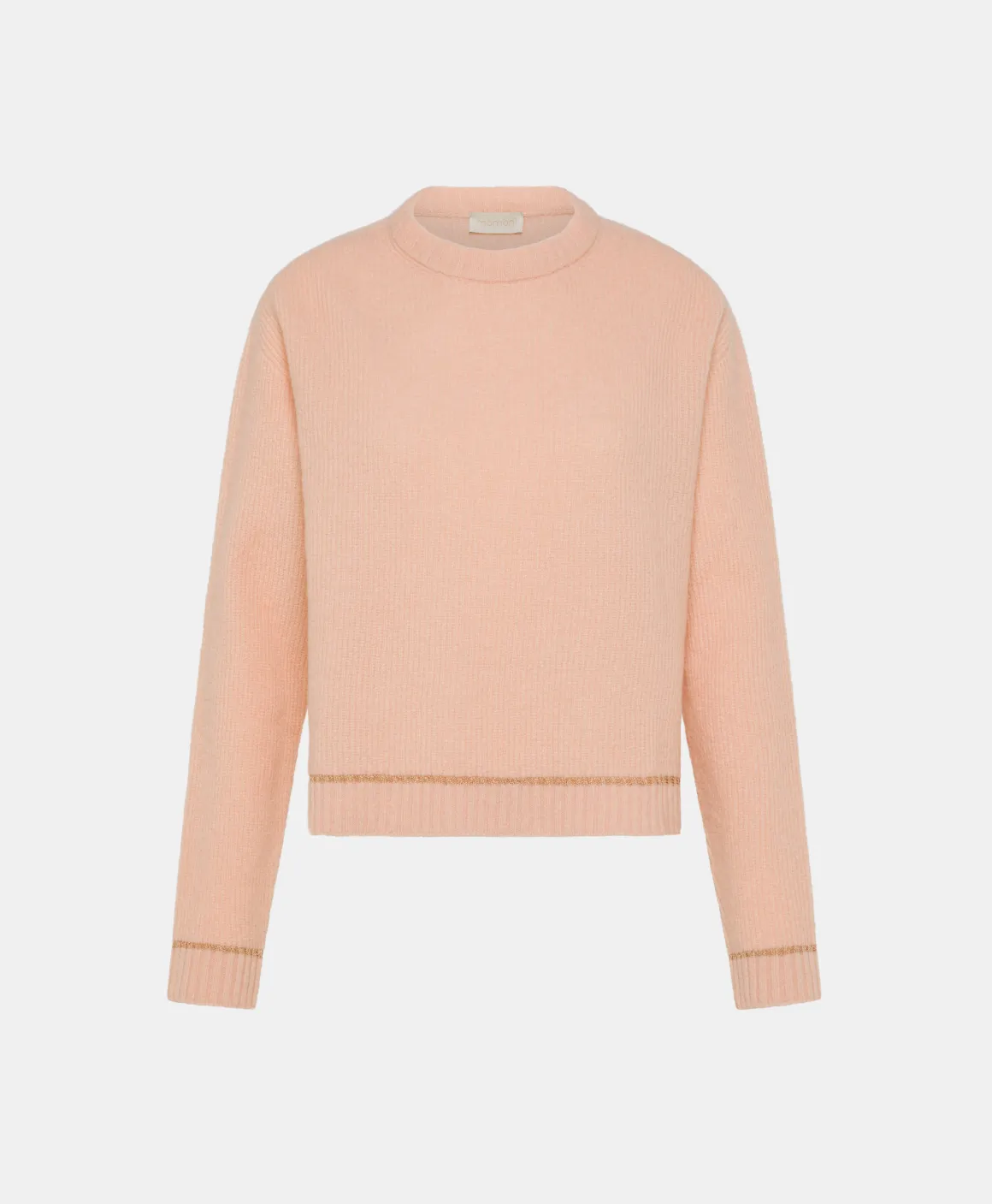 Maglia corta in filato lana Vergine stretch. Girocollo, maniche lunghe con dettaglio su fondo e polsi di un tocco di lurex. Made in Italy.