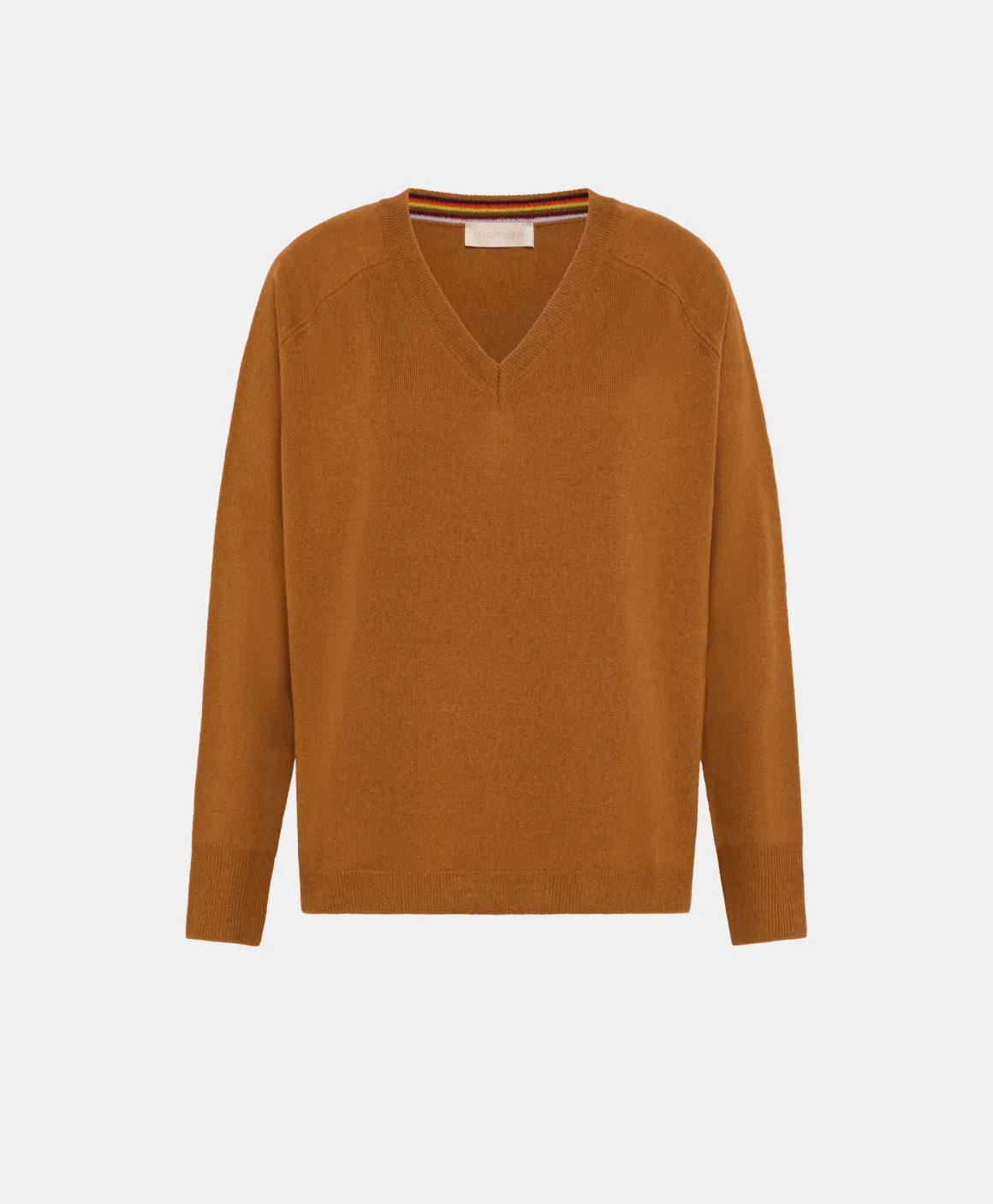 Maglia di lana merinos misto seta cachemire. Volume morbido, maniche lunghe e scollo a “v”, rifinitura a coste su scollo, fondo e polsi. Made in Italy.